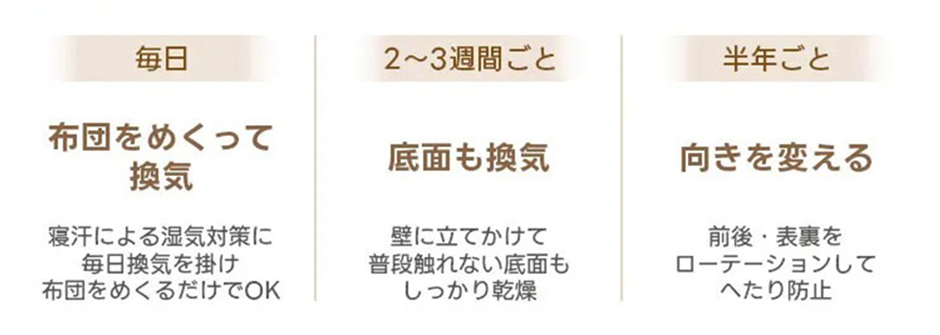 また、直置きは湿気がたまりやすいので、すのこベッドや除湿シートを使うと安心です☆