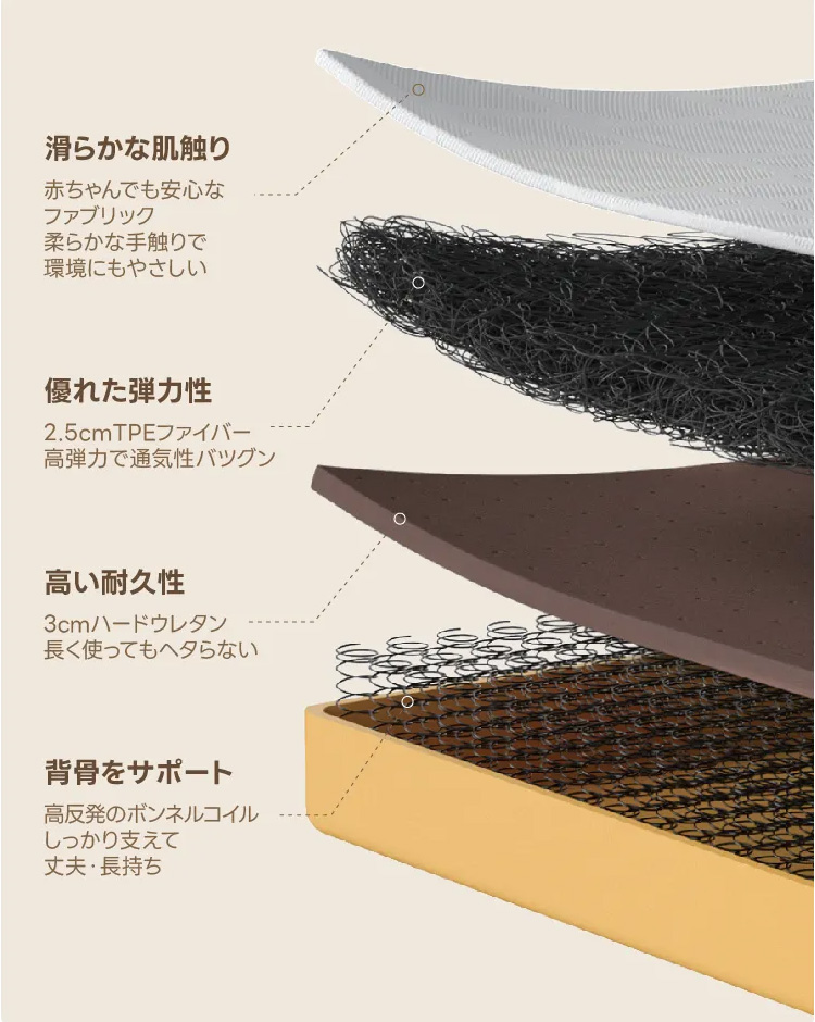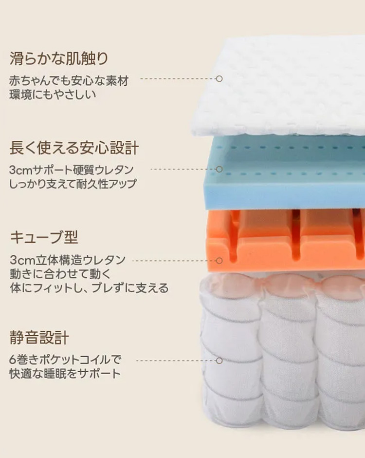 コイルがしっかりと体を支えるので、寝返りがしやすく、長時間使ってもへたりにくいのが特徴です。