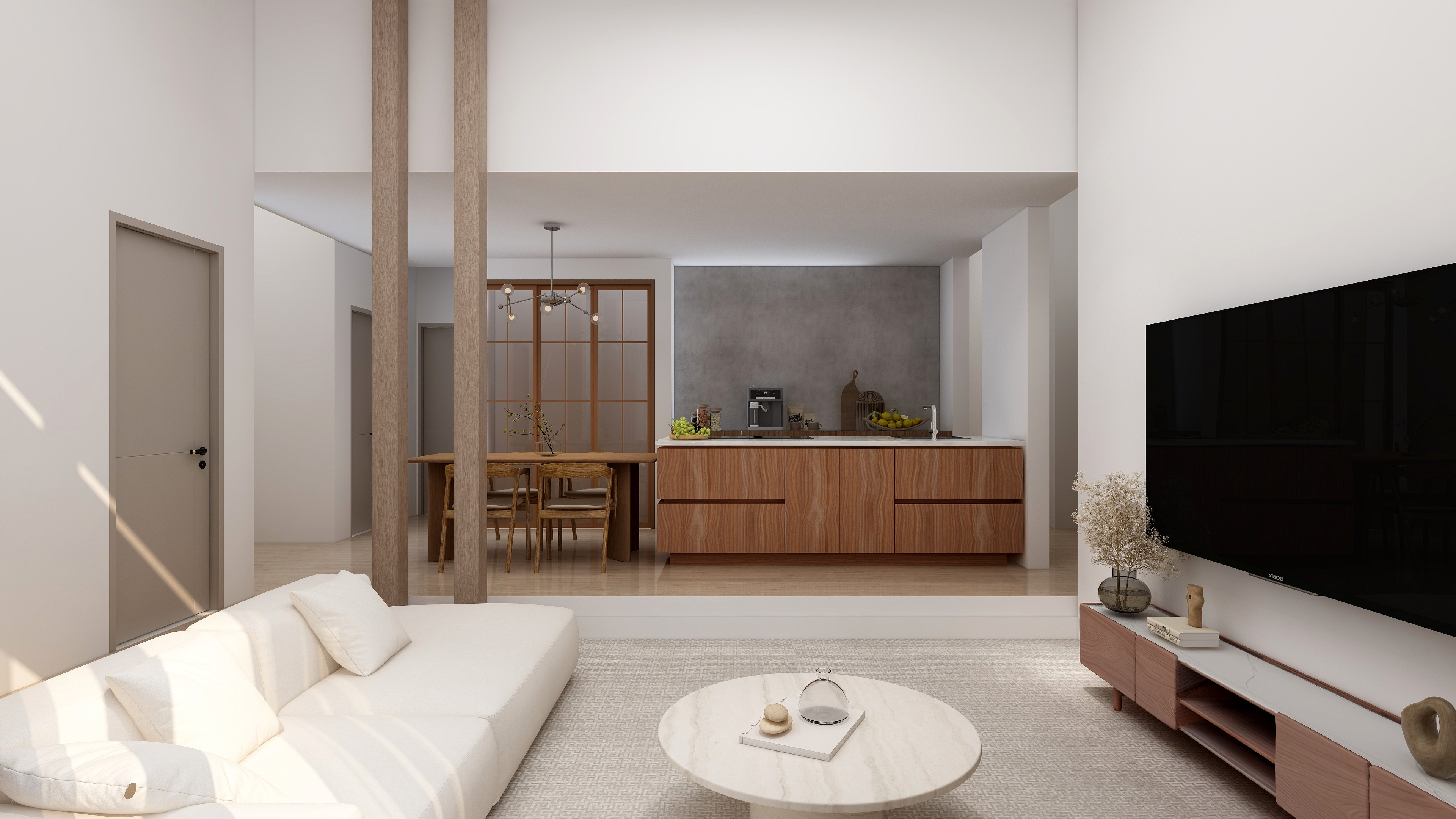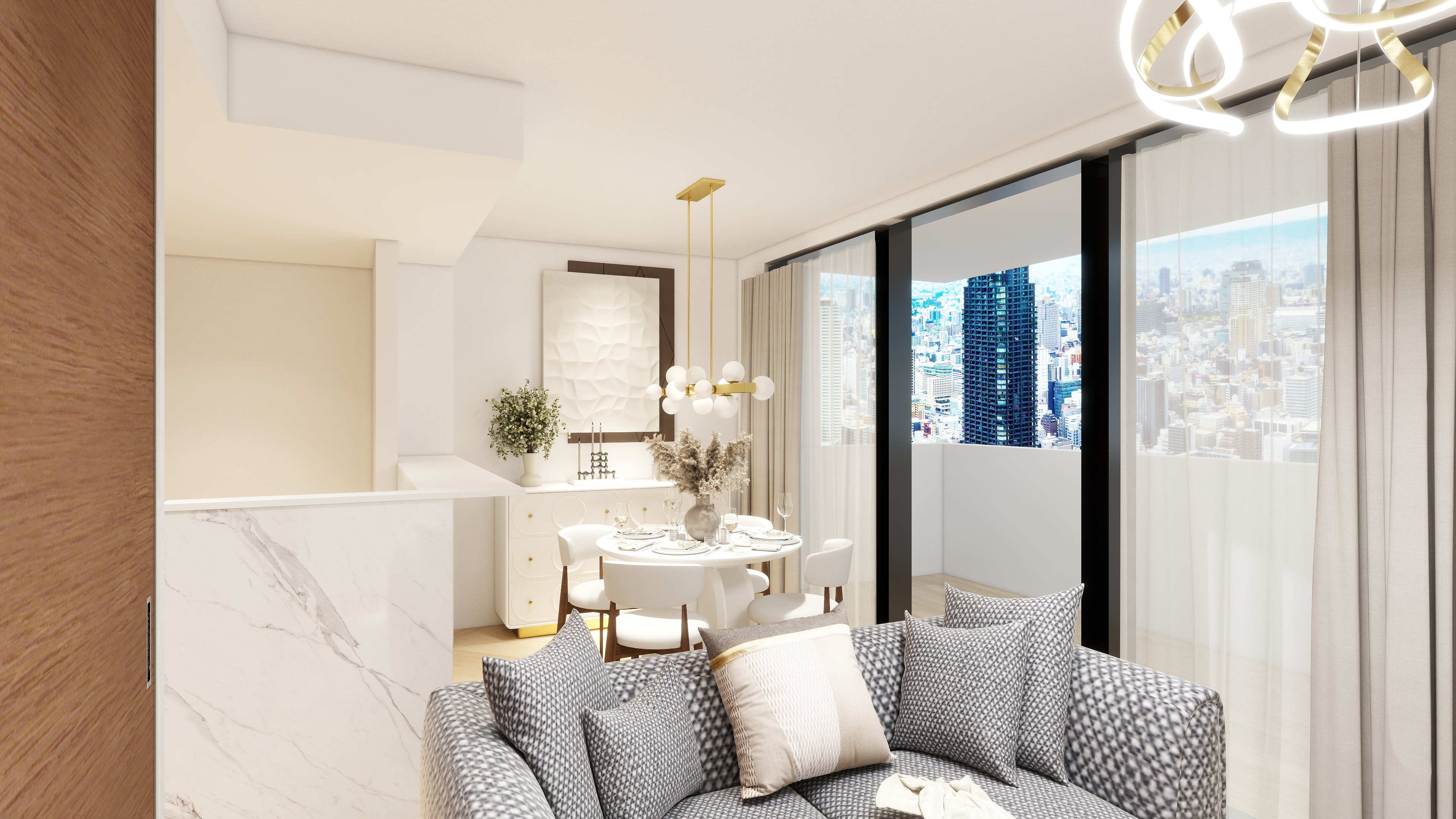 大理石調の素材やゴールドの照明が織りなす、洗練された都会的な「ラグジュアリーモダン」スタイル。窓からの眺望とともに、まるで高級ホテルにいるような上質な時間を演出します。