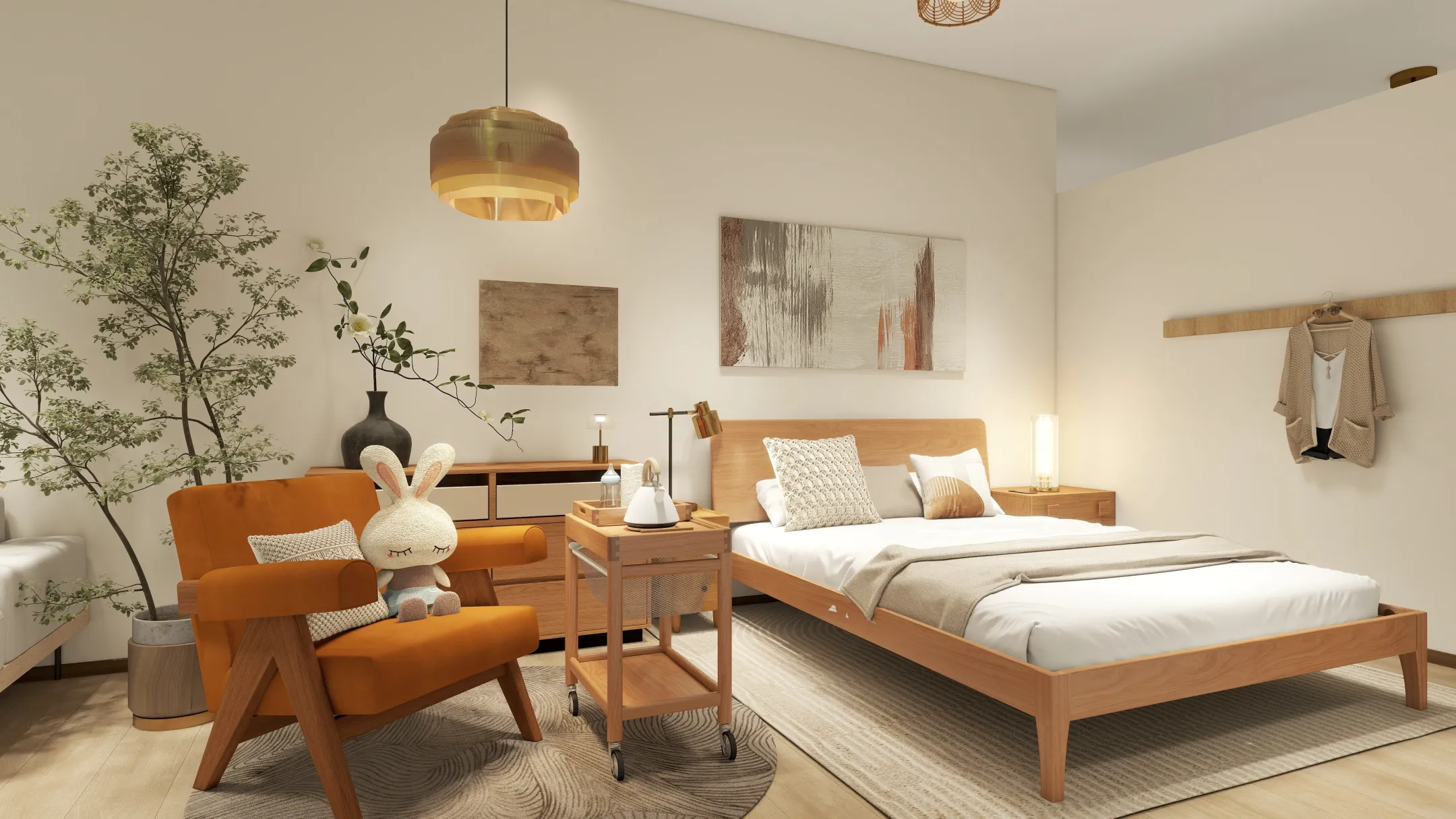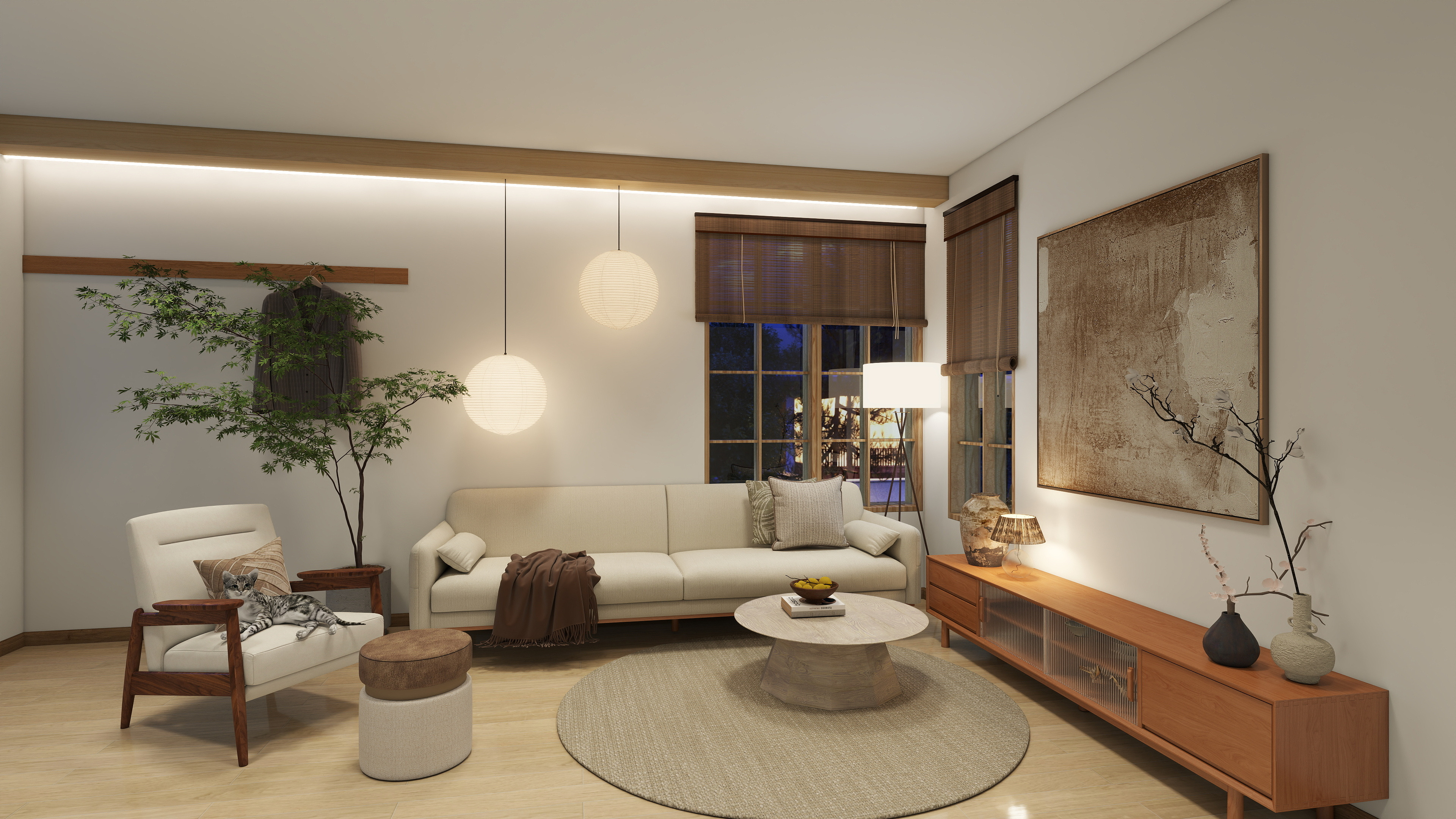 日本のミニマリズムと北欧の温かみのある実用性が調和し、落ち着きのある洗練された空間を作り出します。