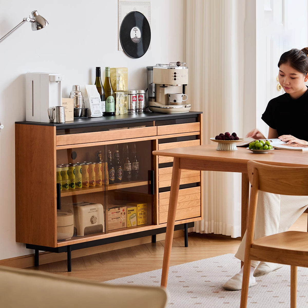 CAGUUUの食器棚・キッチンボードは、サイズ、収納量、使い勝手を考慮し、あなたのライフスタイルにぴったりの一品を見つけるお手伝いをします。可動式の棚板やフルオープンレール付きの引き出しなど、機能性も抜群。コンセントの配置も考慮し、家電の配置にも困りません。