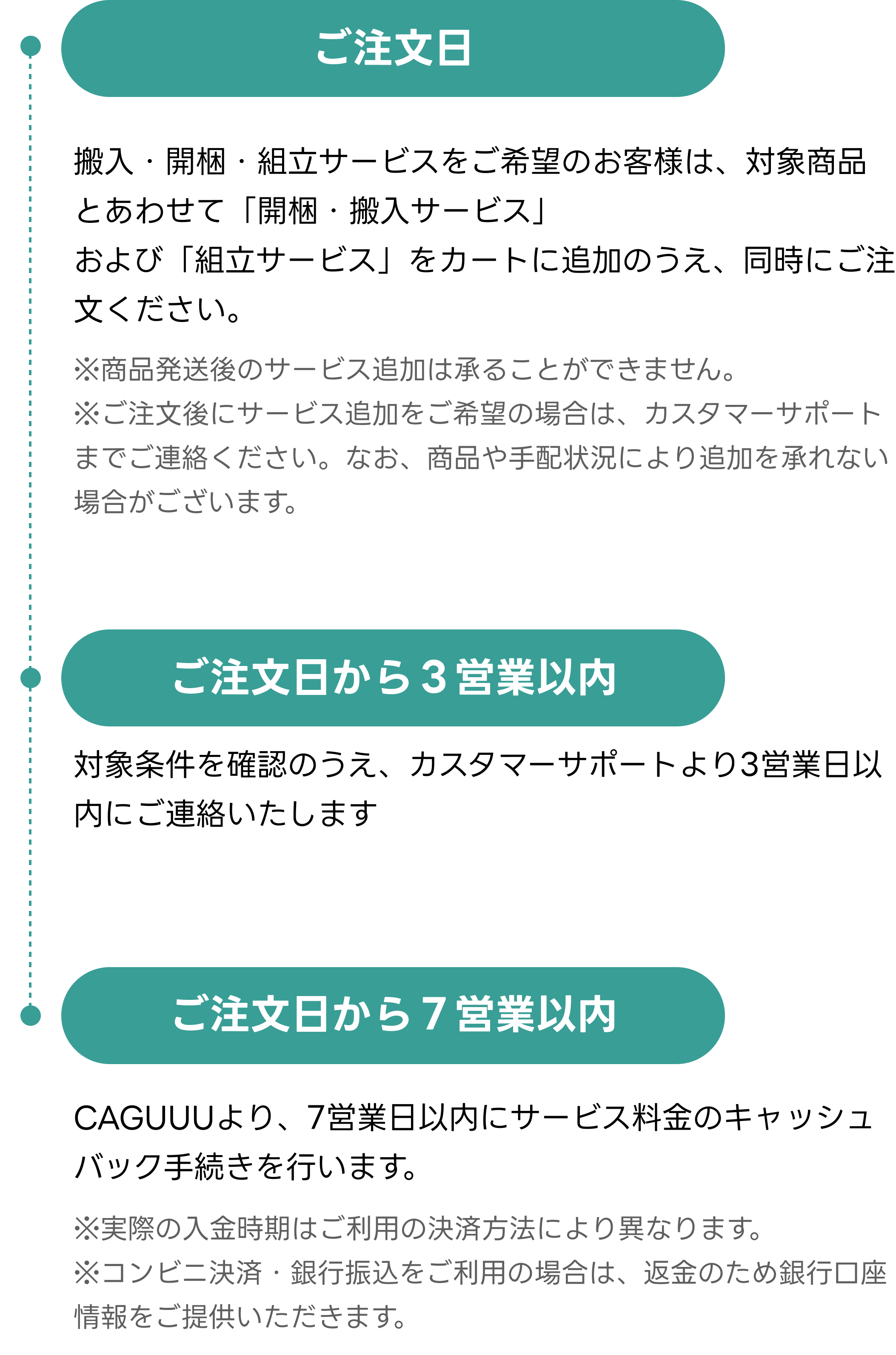 ②商品ページに「開梱・搬入サービス」と「組立サービス」のオプションがある商品が対象となります。
