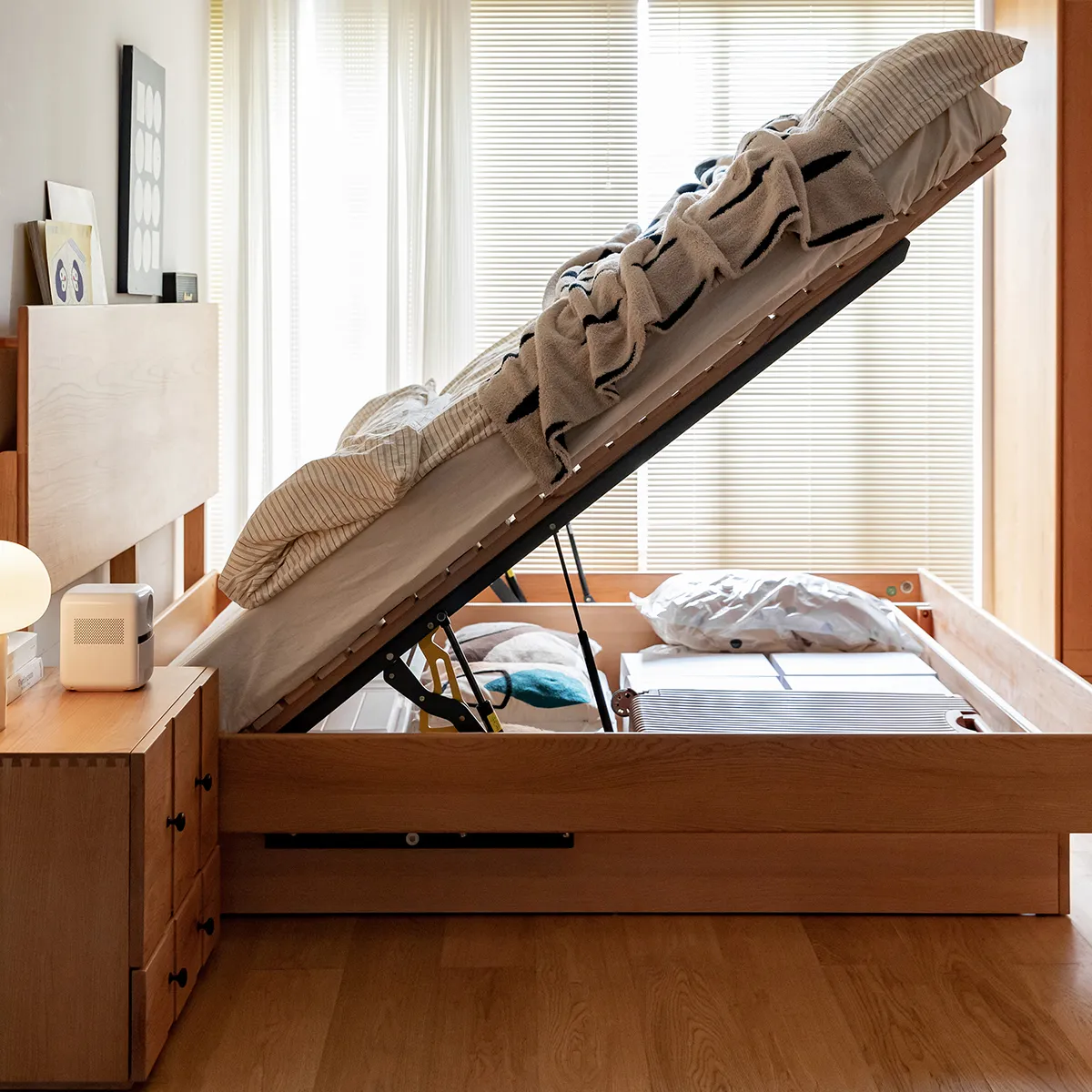 シンプルなデザインと実用性を兼ね備えた一台。厚みのある木材を使用し、ヘッドボードや内部の補強構造で安心感と耐久性を高めました。0.86㎥の大容量収納スペースには四季の衣類もすっきり収まり、専用のガススプリングと安全ロックがあるから、出し入れもカンタンで安全。収納の手間を減らし、空間をすっきりさせるベッドです。