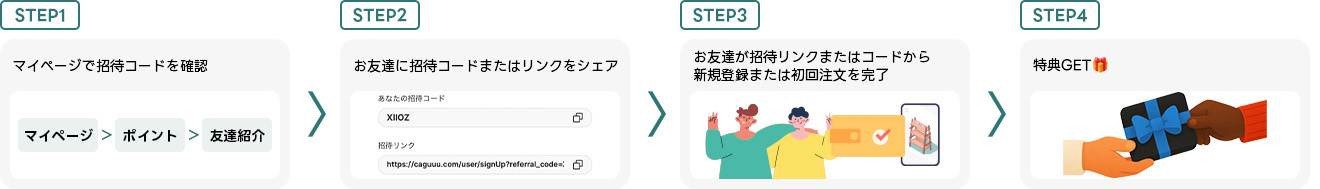 💬 紹介するほど、お得が広がる!友達と一緒にCAGUUUを楽しもう!