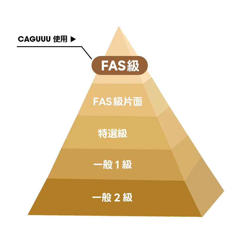 全米広葉樹製材協会(NHLA)は製材工程で木材を格付けしており、FAS級>FAS級片面>特選級>一般1級>一般2級の等級を決定しています。