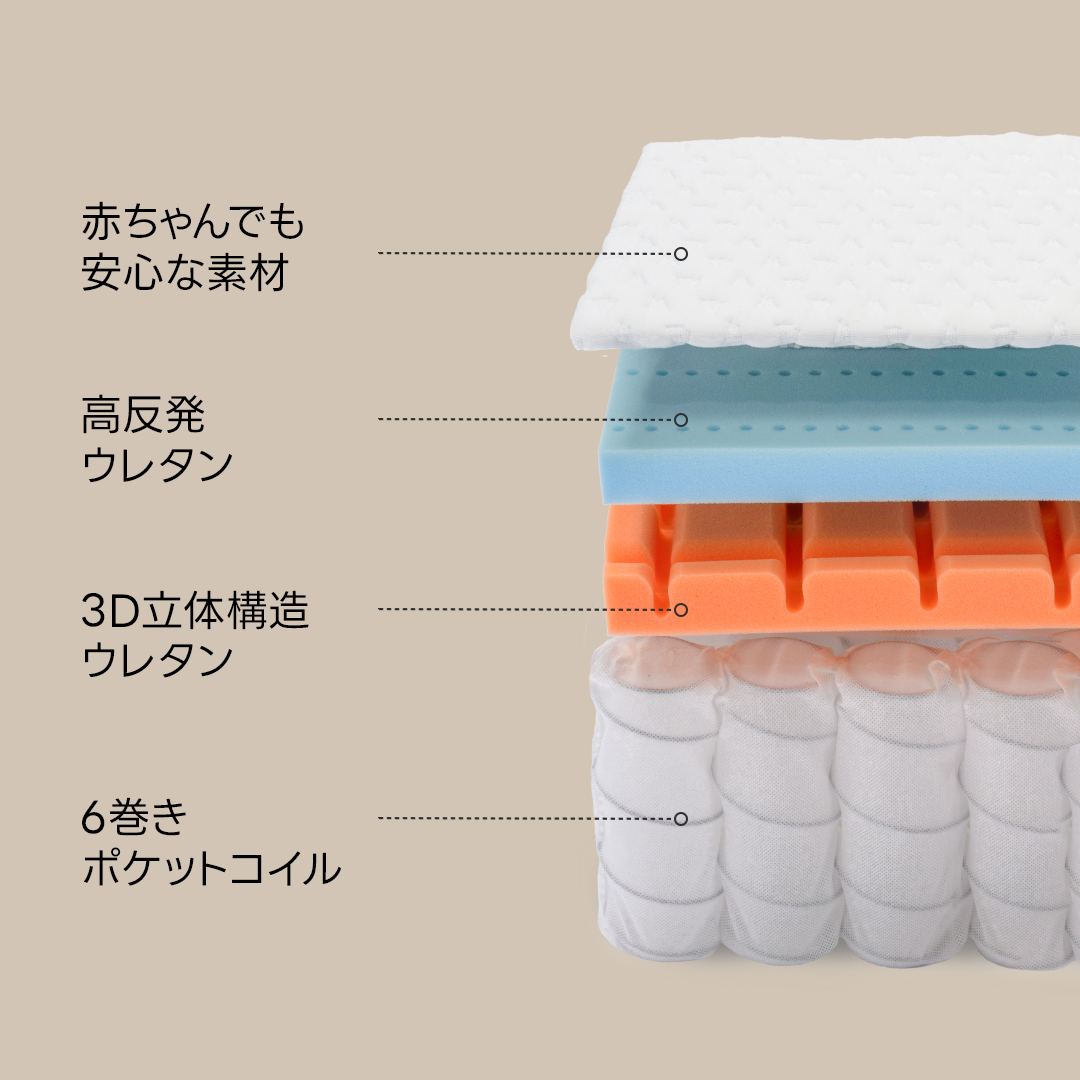 ベッドフレームだけでなく、合わせて使用するマットレスによって睡眠の質は大きく変わります。質の良いマットレスは身体をしっかりと支えつつも体圧を適度に分散し、脊椎を正しい姿勢に保ってくれます。そこで、CAGUUUならではの高性能なマットレスもご紹介!