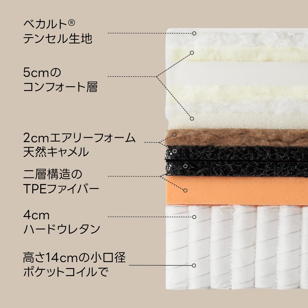 7層の高品質素材が織りなすプレミアムなマットレス。超軽量のソフトウレタンが体を包み込むような優しさを感じさせ、贅沢な寝心地を体感。パット部分は取り外し可能なので、2つの選べる寝心地からお好みに合わせてお選びいただけます。