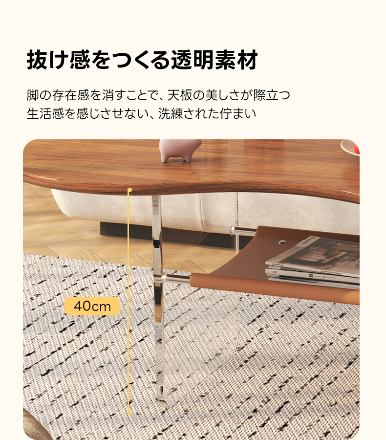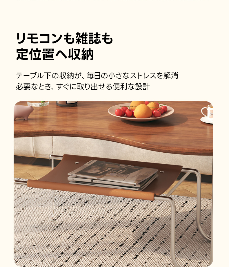 - 【便利な収納スペース】テーブル下にはリモコンや雑誌をすっきりと収納できるスペースがあり、リビングを常に整頓された状態に保ちます。