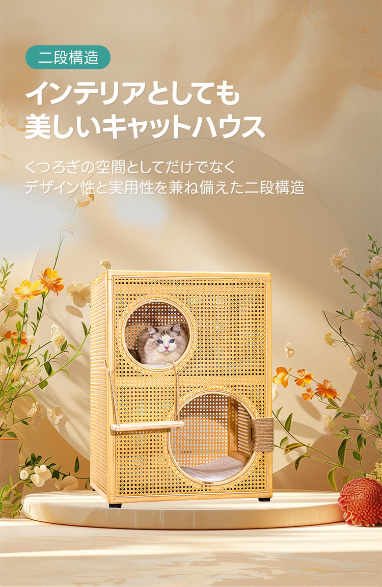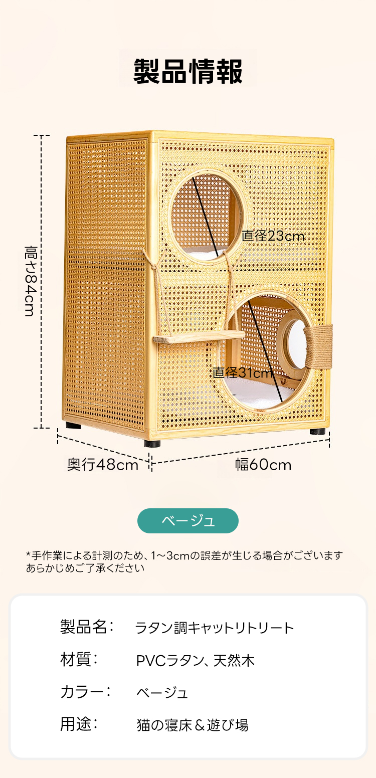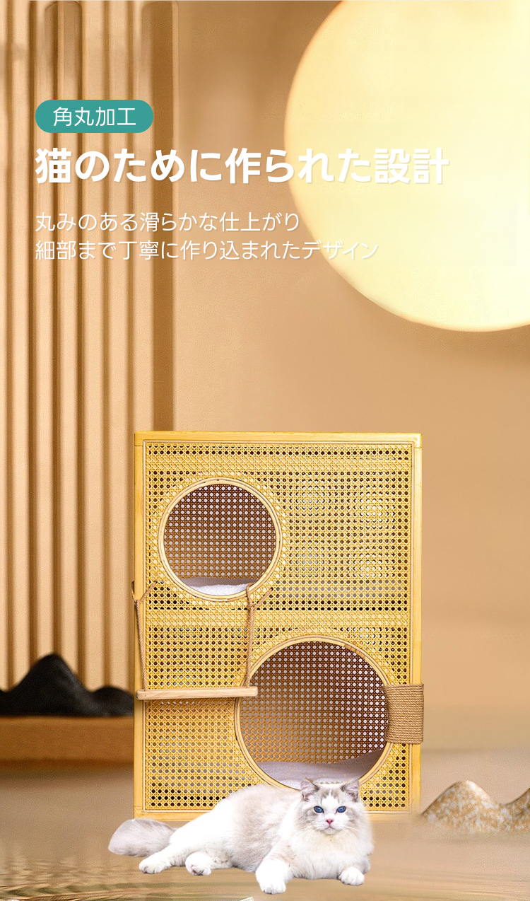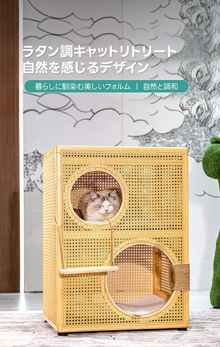- 【快適なペットスペース】:ラタン調キャットリトリートは、ペットにとって快適でスタイリッシュなスペースを提供します。ナチュラルなベージュカラーでインテリアに調和し、どんな部屋にも自然な雰囲気を演出します。