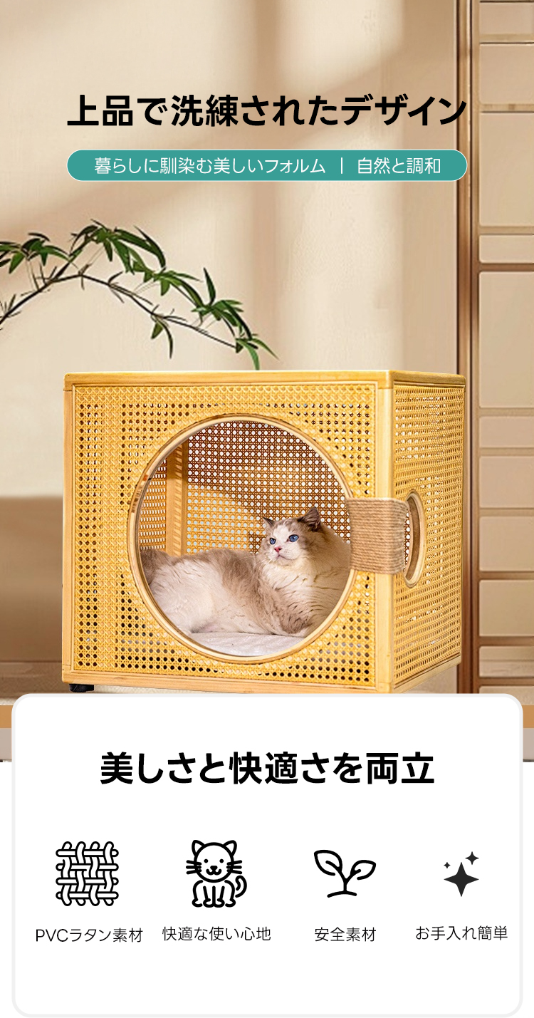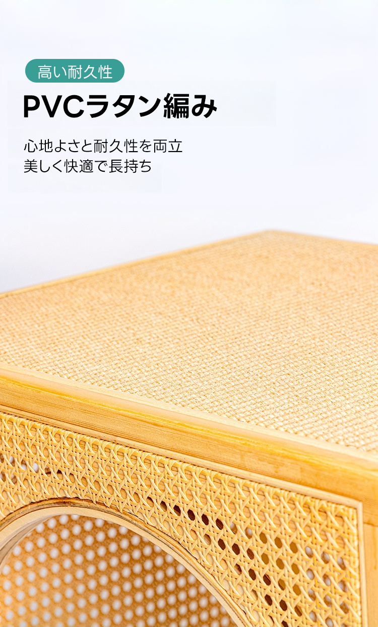 - 【耐久性のある素材と高品質なデザイン】:PVCラタンと天然木を使用しており、耐久性と美しさを兼ね備えています。丸みのある滑らかな仕上がりで、猫ちゃんが快適に過ごせるよう細部まで丁寧に作り込まれています。長期間美しい状態を保ちます。