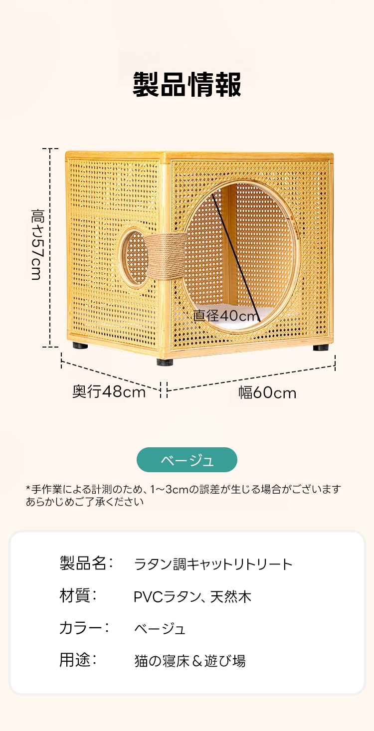 - 【上品で洗練されたデザイン】:ラタン調キャットリトリートは、猫ちゃんのためにデザインされた美しいキャットハウスです。ナチュラルなベージュカラーがどんなインテリアにも調和し、ペット家具としても存在感を放ちます。猫の寝床や遊び場として最適な長方形のデザインで、猫ちゃんの快適な居場所を提供します。