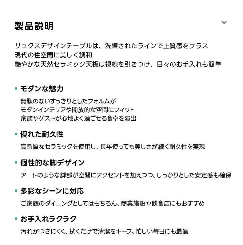 - 【高品質な素材と耐久性】高品質な天然セラミック天板とカーボンスチール製の脚部を使用し、優れた耐久性を実現。長年の使用でも美しさが続き、耐熱性や耐摩耗性にも優れています。