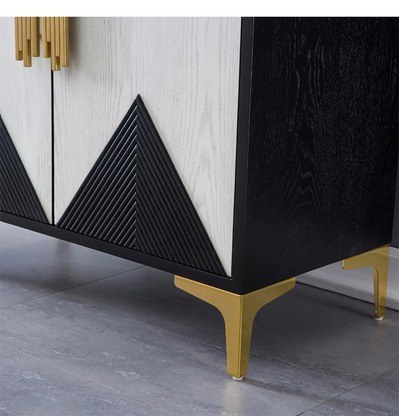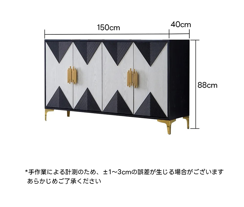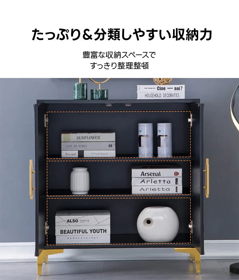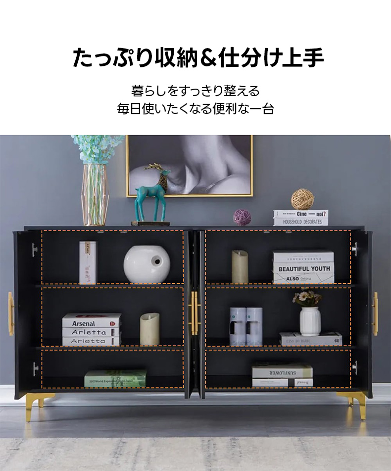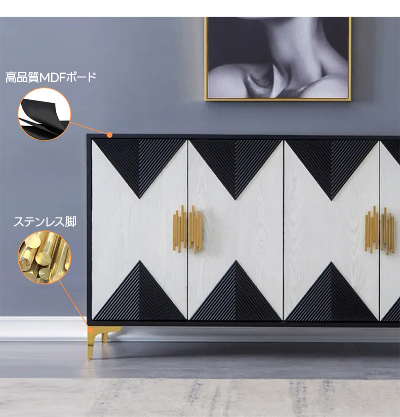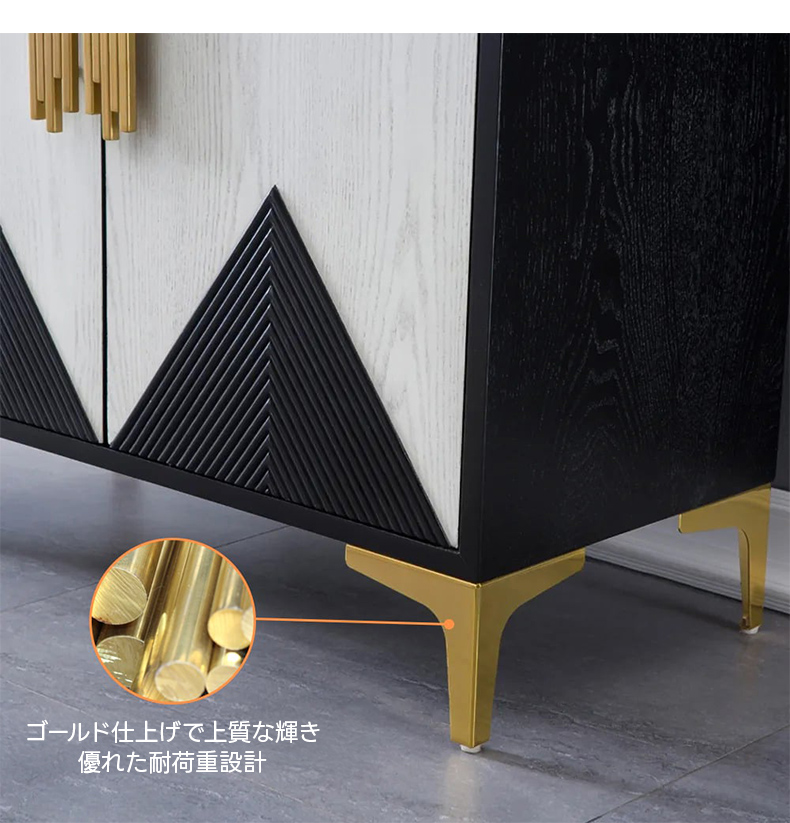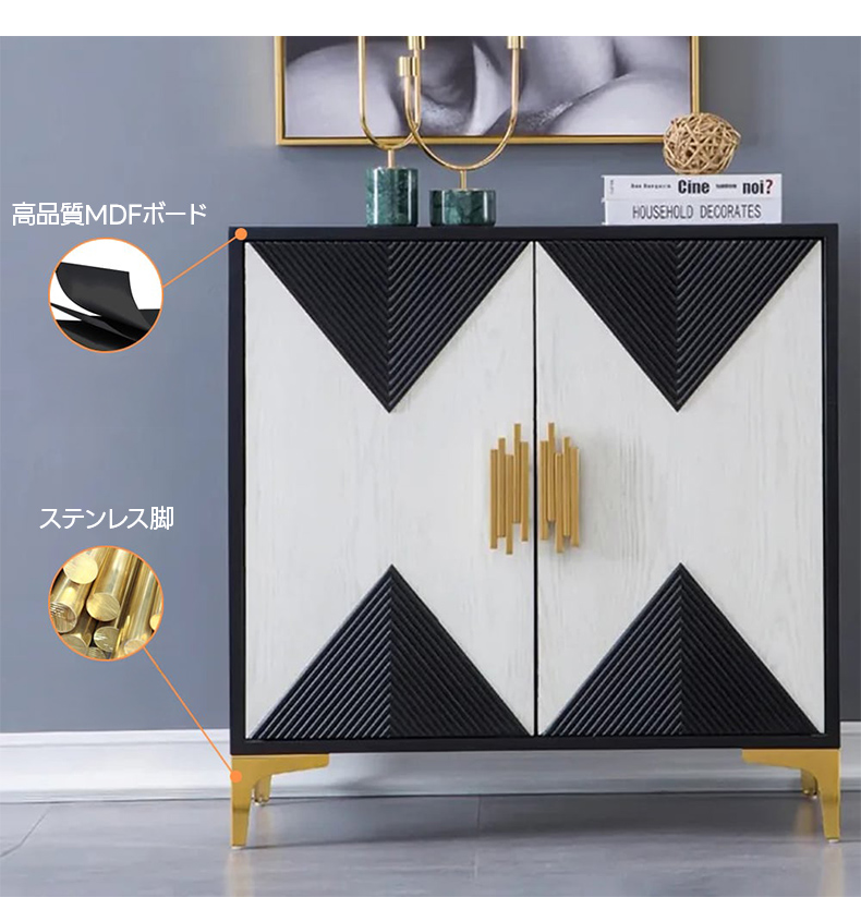 - 【スタイリッシュなデザインと高機能性】幾何学デザインモダンキャビネットは、北欧風の洗練されたデザインと実用性を兼ね備えた収納家具です。ブラックを基調とした合成板の長方形フォルムに、ゴールドのアクセントが映えるスタイリッシュな仕上がりが特徴です。リビングやダイニングでの使用に最適で、可動棚板により収納スペースを自由に調整可能です。