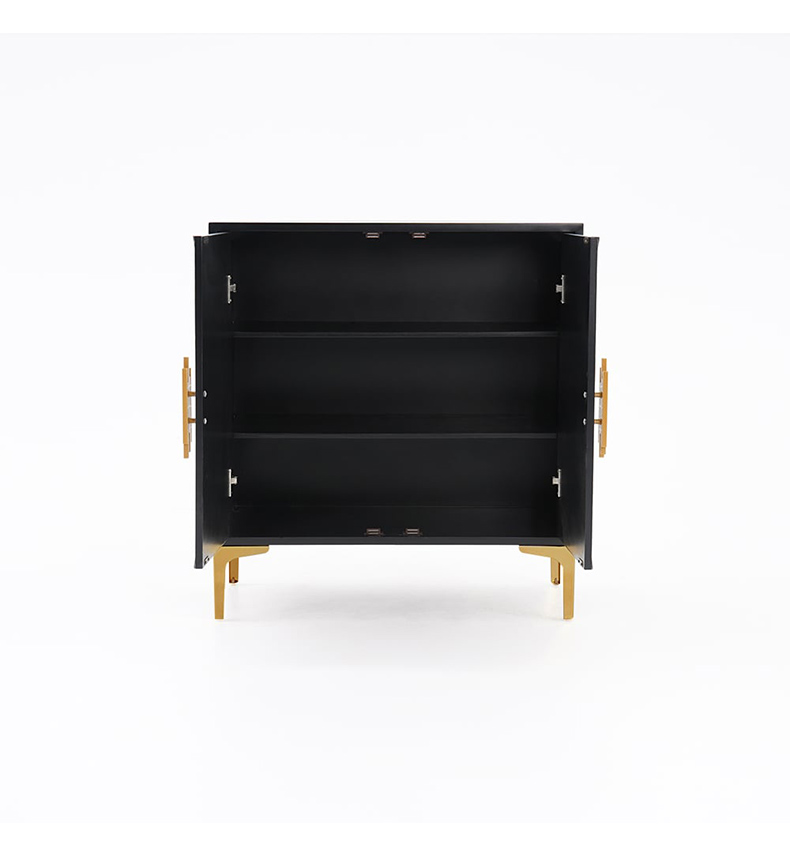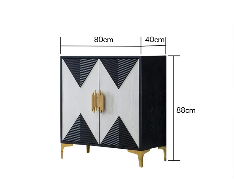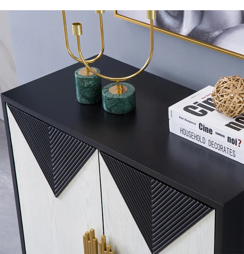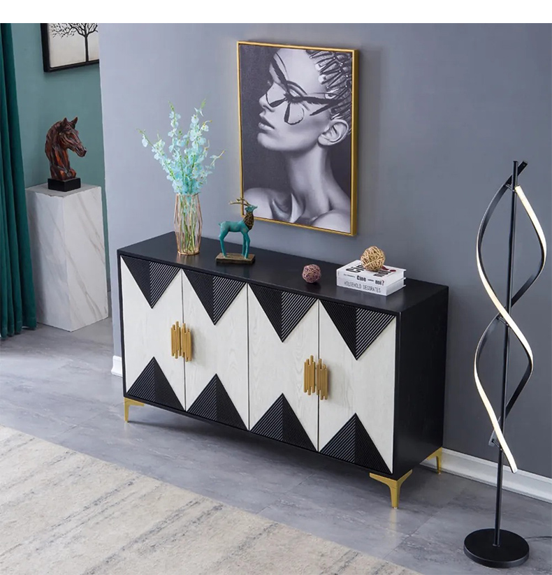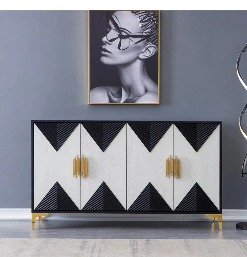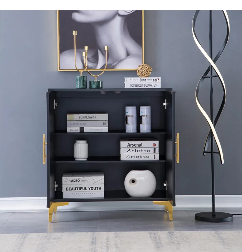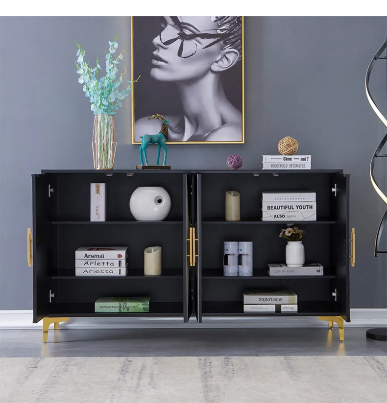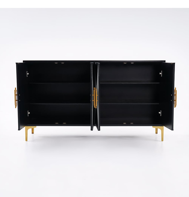 - 【スタイリッシュなデザインと高機能性】幾何学デザインモダンキャビネットは、北欧風の洗練されたデザインと実用性を兼ね備えた収納家具です。ブラックを基調とした合成板の長方形フォルムに、ゴールドのアクセントが映えるスタイリッシュな仕上がりが特徴です。リビングやダイニングでの使用に最適で、可動棚板により収納スペースを自由に調整可能です。