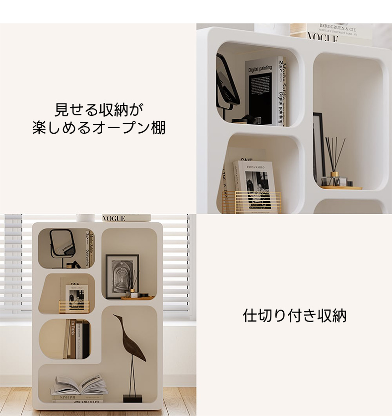 - 【オープン収納で見せる収納を楽しむ】オープン棚は小物や本をすっきりと整理でき、仕切りがあるためアイテムを分類して収納するのに便利です。見せる収納を楽しむことで、インテリアの一部として活用できます。