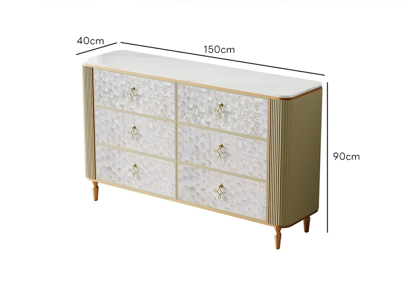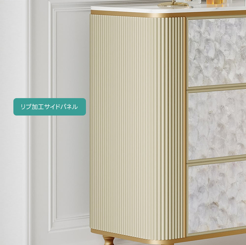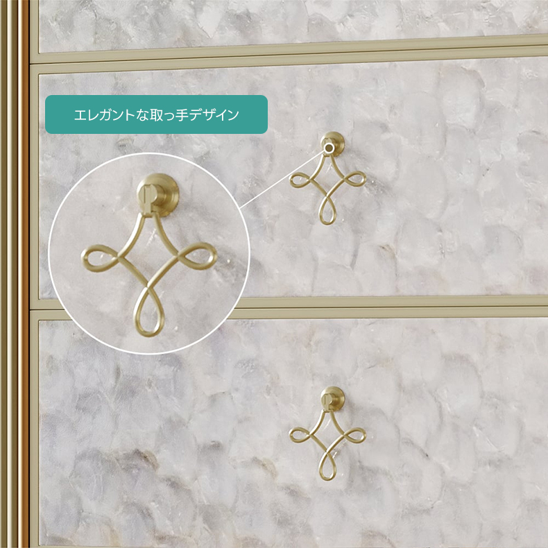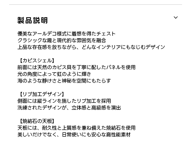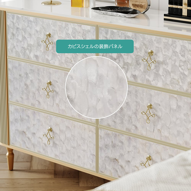 - 【優雅なアールデコデザイン】:グレースデザインモザイクチェストは、アールデコ様式を取り入れた優雅なデザインが特徴です。カピスシェルパネルが虹色に輝き、リブ加工の側面が立体感を演出し、空間に高級感をもたらします。