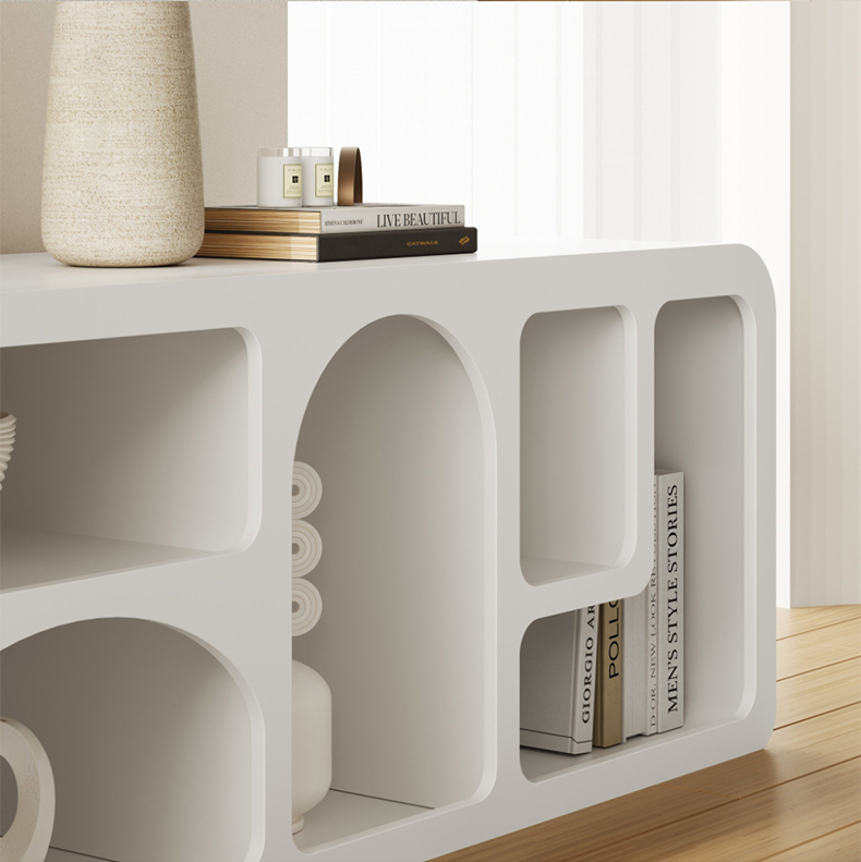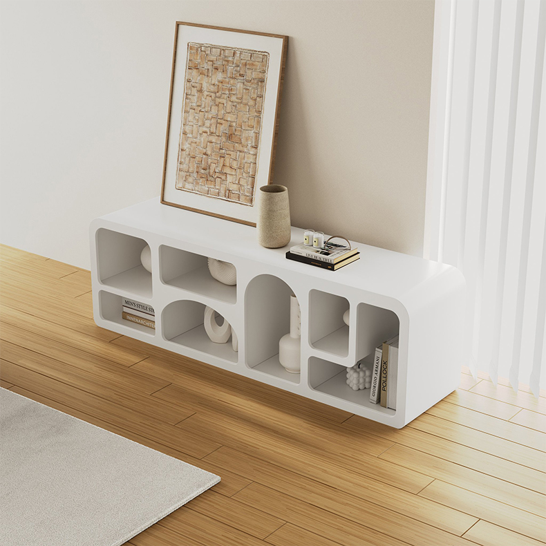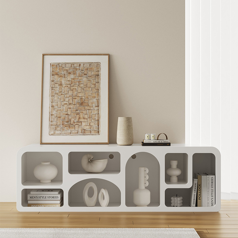 - 【多機能収納&デザイン性】このホワイトTVボードは、テレビ台としての機能に加え、ブックシェルフとしても使用可能です。多様な用途に対応するマルチ収納が魅力で、不規則に配置された棚がユニークなデザインを生み出します。