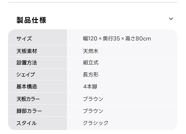 - 【高品質な素材とデザイン】:天然ウォールナット材を使用し、幅120cm、奥行35cm、高さ80cmの長方形で、安定感抜群の4本脚構造を採用。クラシックなデザインが魅力のこのテーブルは、上質なブラウンの色合いが特徴です。