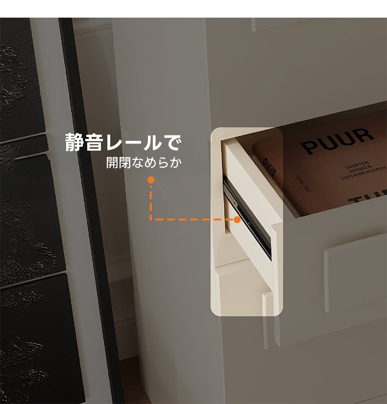 - 【高品質な合成板と静音レール】耐久性に優れた合成板を使用し、静音レールを採用した引き出しは開閉がなめらかで快適です。シンプルでモダンなデザインがどんなインテリアにも調和し、長く愛用いただけます。
