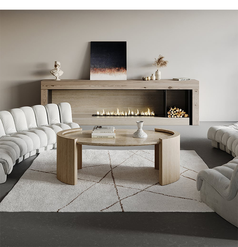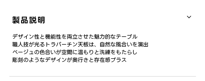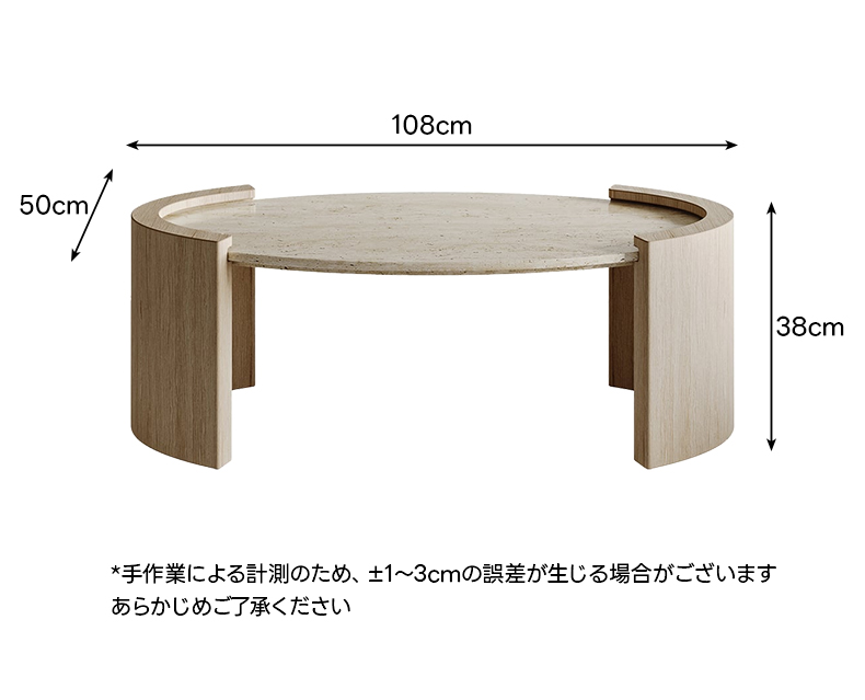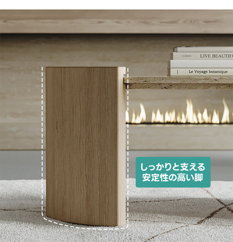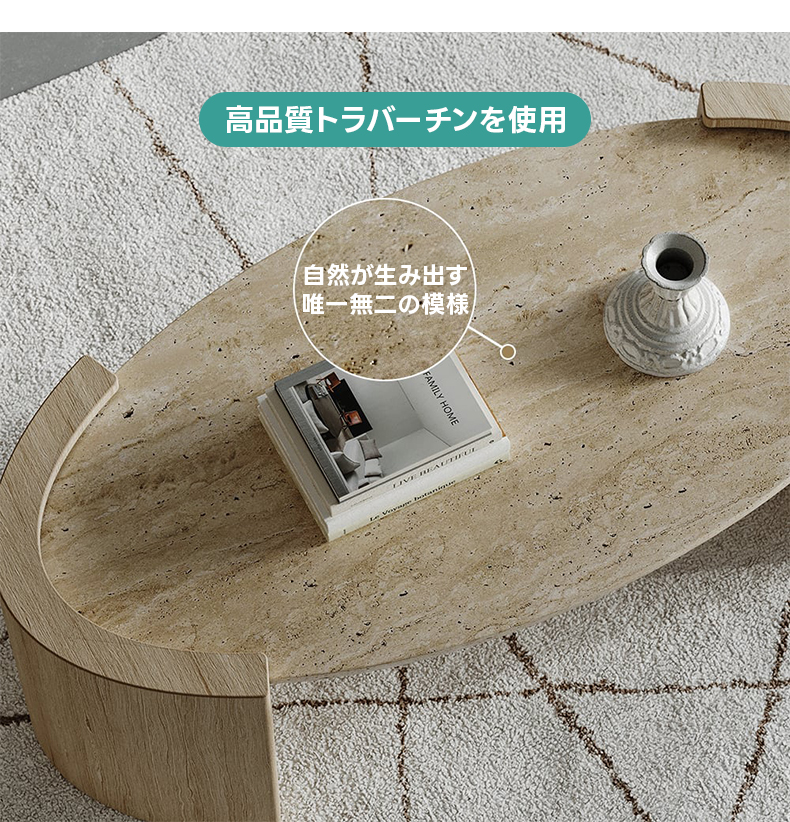- 【高品質な素材と職人技】天板には高品質なトラバーチンを使用し、自然が生み出す唯一無二の模様が魅力です。脚部には安定性の高い合成木材を使用し、しっかりと支える設計です。