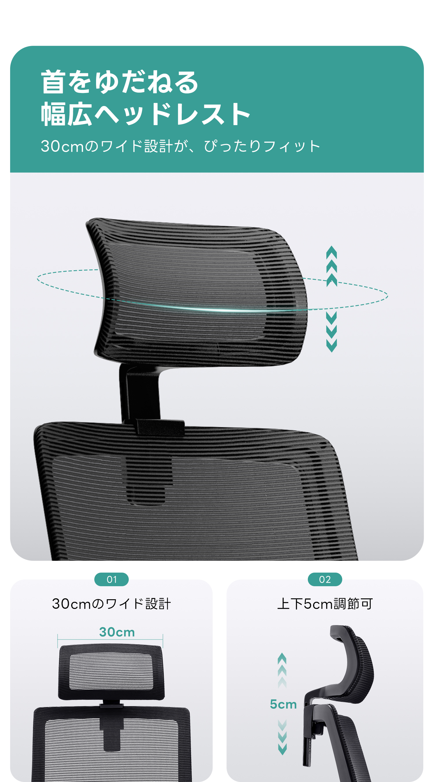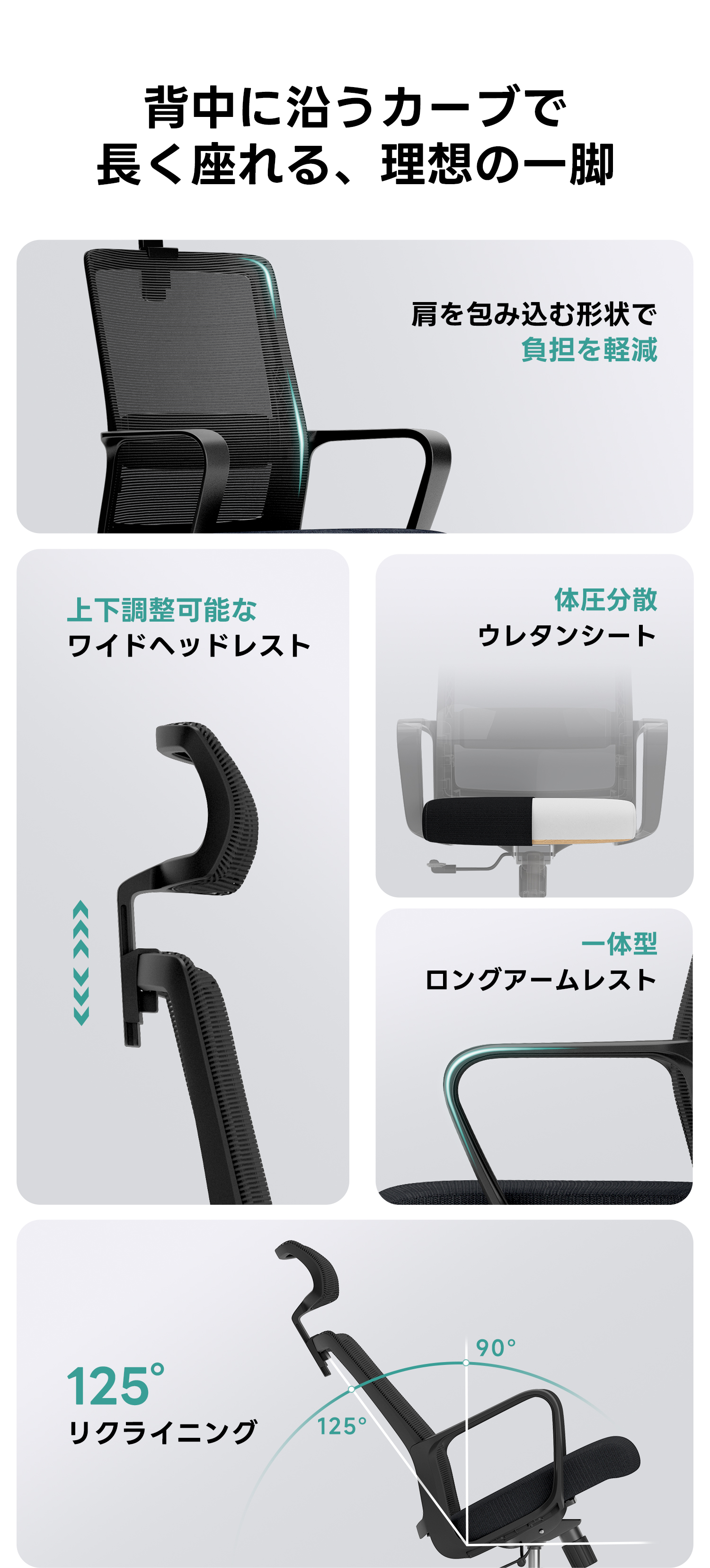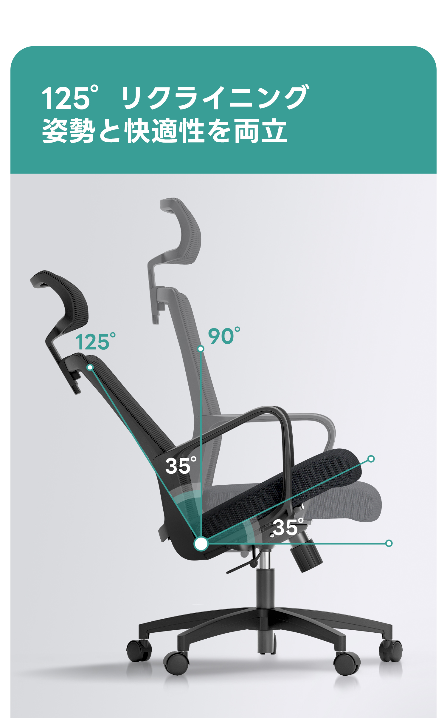 - 【多機能で快適な使用感】125°のリクライニング機能を備え、姿勢と快適性を両立します。さらに、上下調整可能なワイドヘッドレストが首をしっかりサポートし、個々のニーズに合わせた調整が可能です。