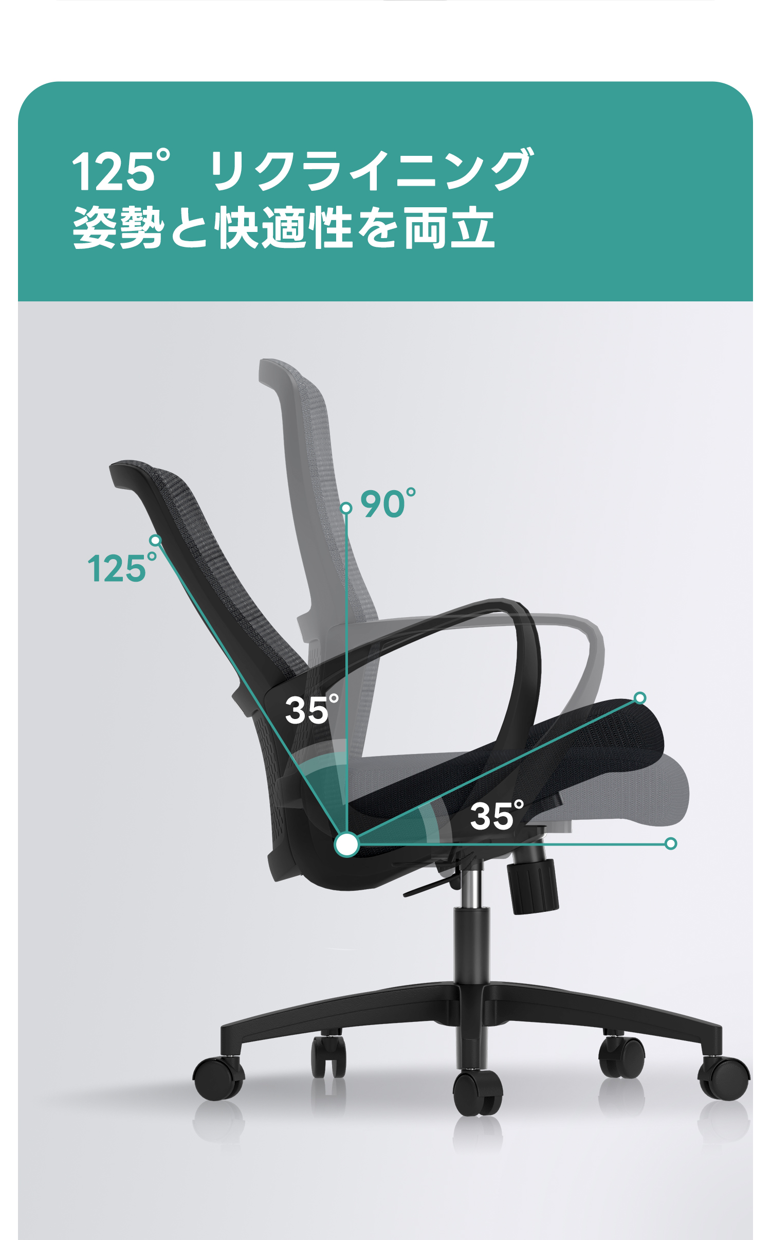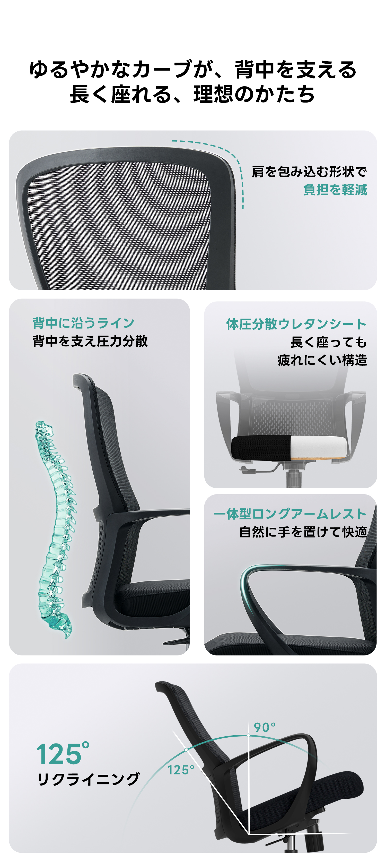 - 【快適な使用体験】:125°までリクライニング可能で、個々の好みに合わせて最適な座り心地を実現します。一体型ロングアームレストが自然に腕をサポートし、快適な作業をサポートします。