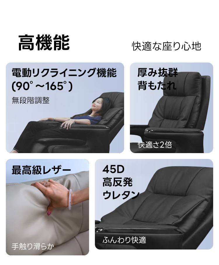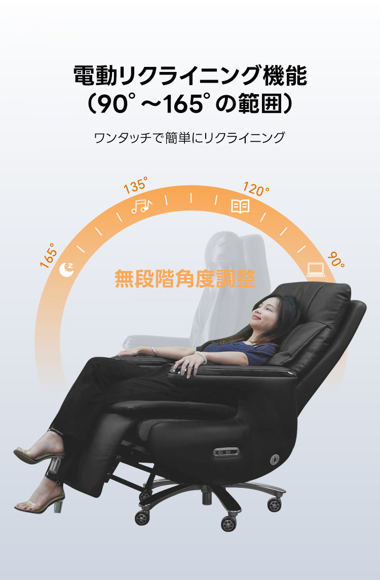 - 【電動リクライニング機能搭載】このオフィスチェアは、90°から165°までの無段階調整が可能な電動リクライニング機能を備えています。ワンタッチで簡単にリクライニングでき、快適な姿勢を保ちながら長時間の作業をサポートします。