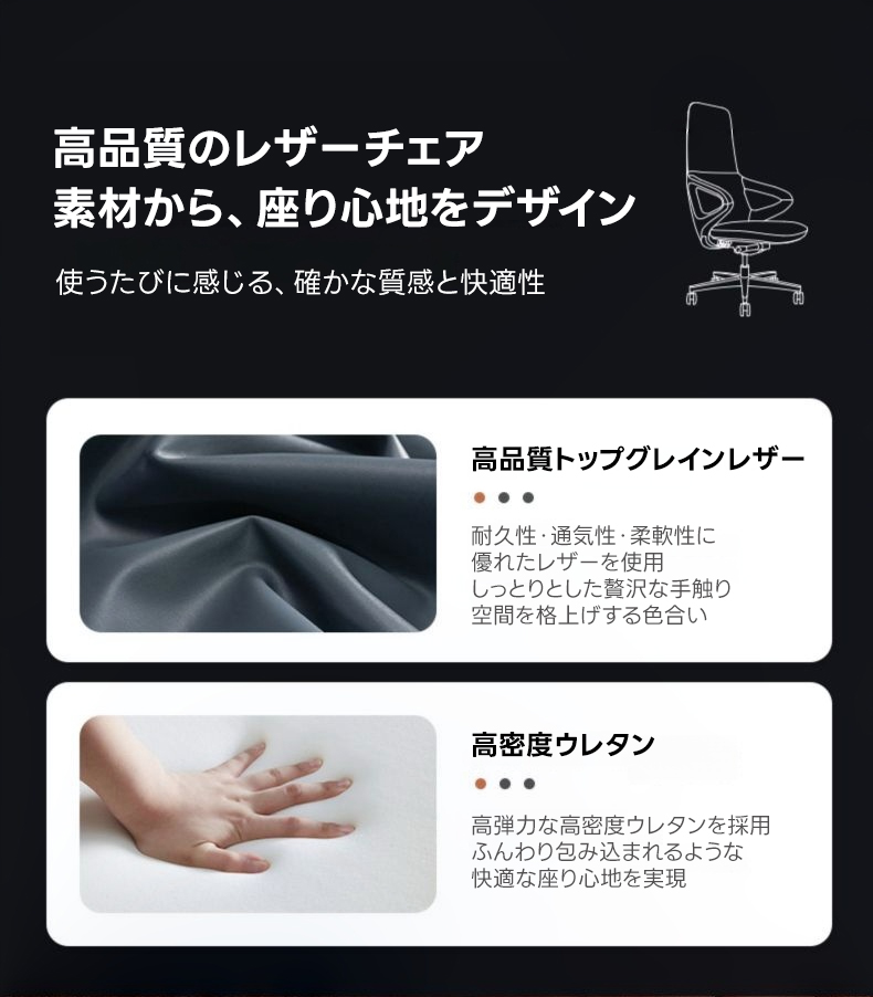 - 【高品質素材と耐久性】耐久性、通気性、柔軟性に優れたトップグレインレザーを使用し、贅沢な手触りを実現。高品質ガスシリンダーとアルミ合金脚部により、安定感と耐腐食性を確保しています。