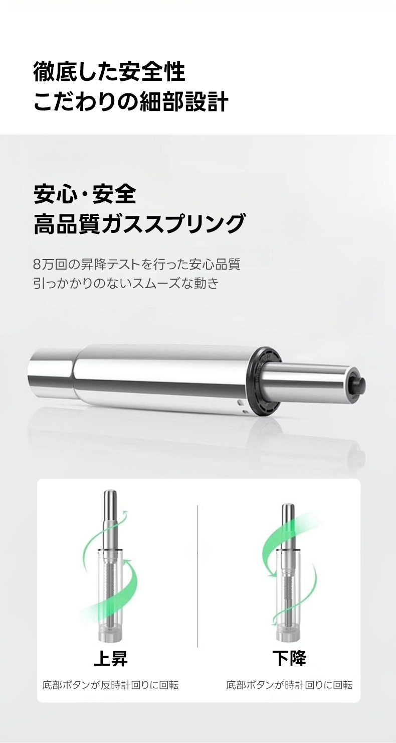 - 【安心の安全性と耐久性】高品質のガススプリングを使用し、8万回の昇降テストをクリアしています。スチールベースが振動と騒音を軽減し、耐荷重性のあるアルミ脚が安定した座り心地を提供します。