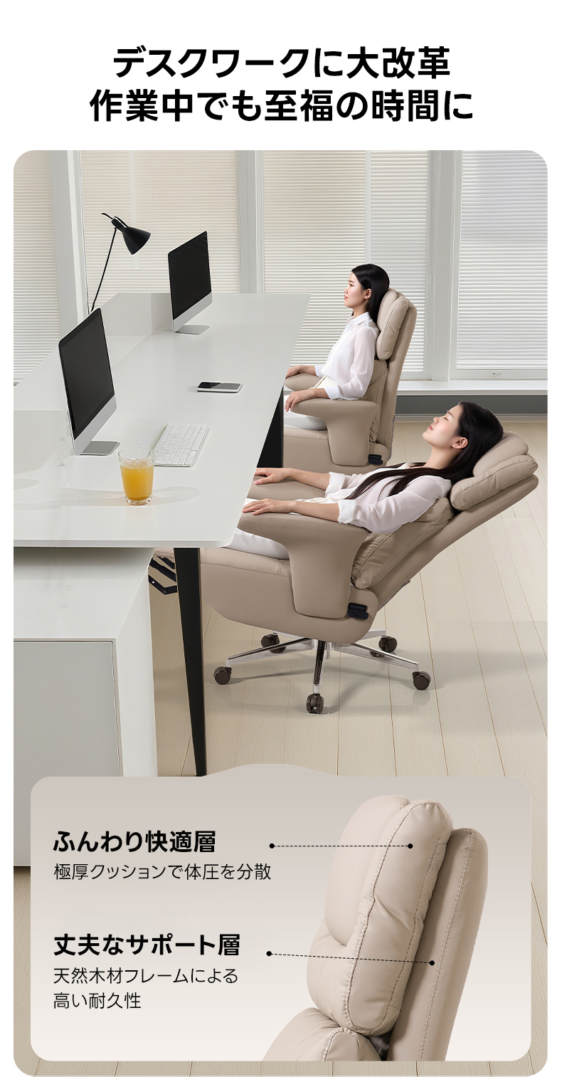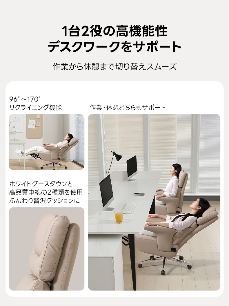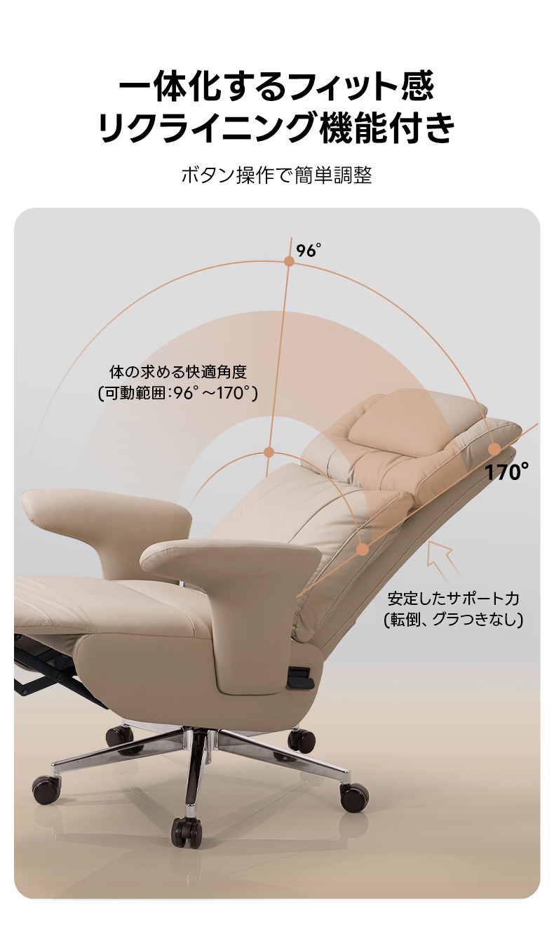 - 【リクライニング機能で快適な作業環境】このデスクチェアは、96°から170°まで背もたれを調整可能なリクライニング機能を備えています。作業中の姿勢を自由に調整でき、リラックスしたい時にはスムーズに切り替えが可能です。長時間のデスクワークでも快適に過ごせます。