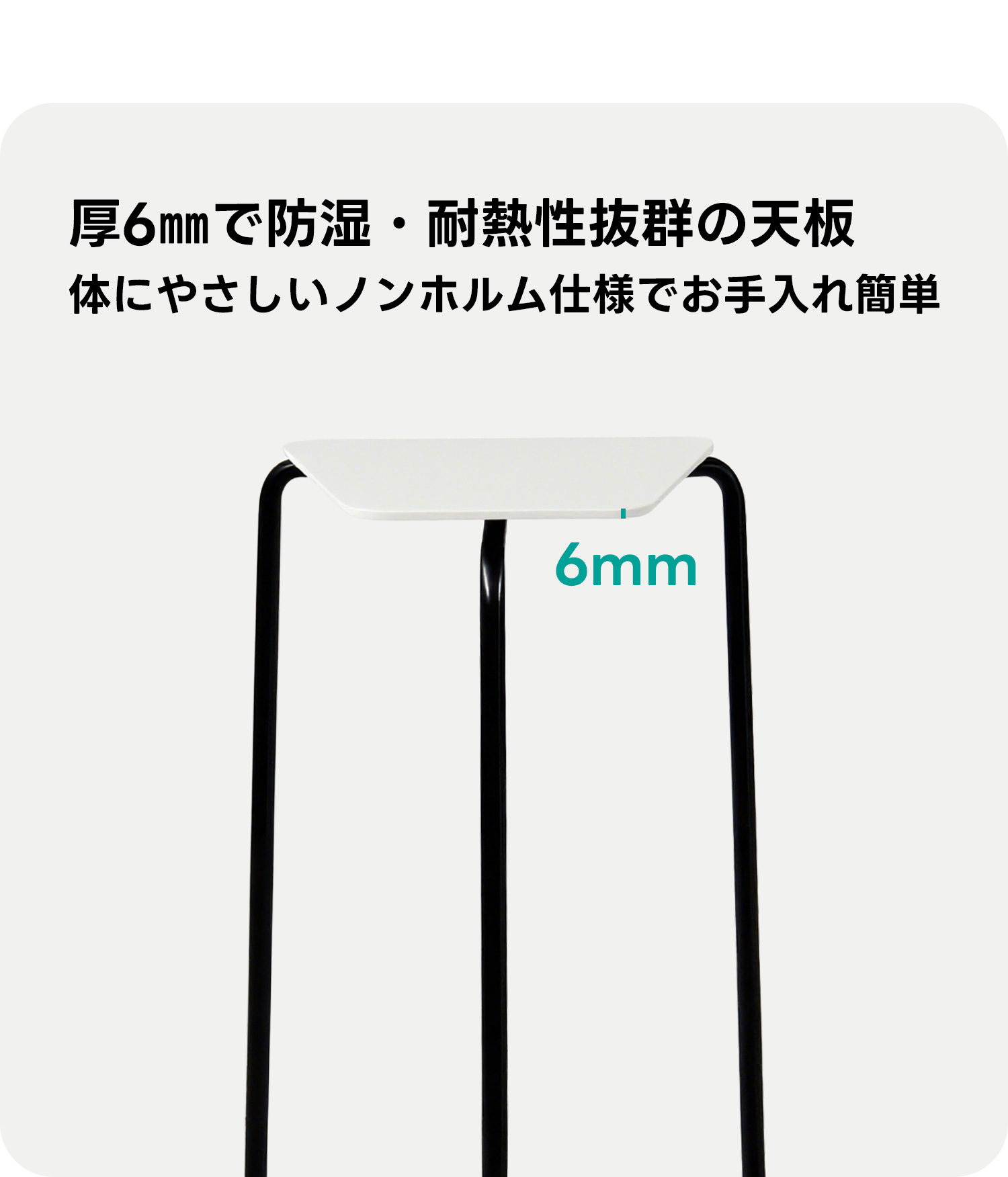 - 【高品質素材とデザイン】天板には防湿・耐熱性に優れたコンパクトラミネート板を使用し、ノンホルム仕様で安全性を確保。16mmのスチールパイプは静電粉体塗装が施されており、耐久性と安定性を兼ね備えています。
