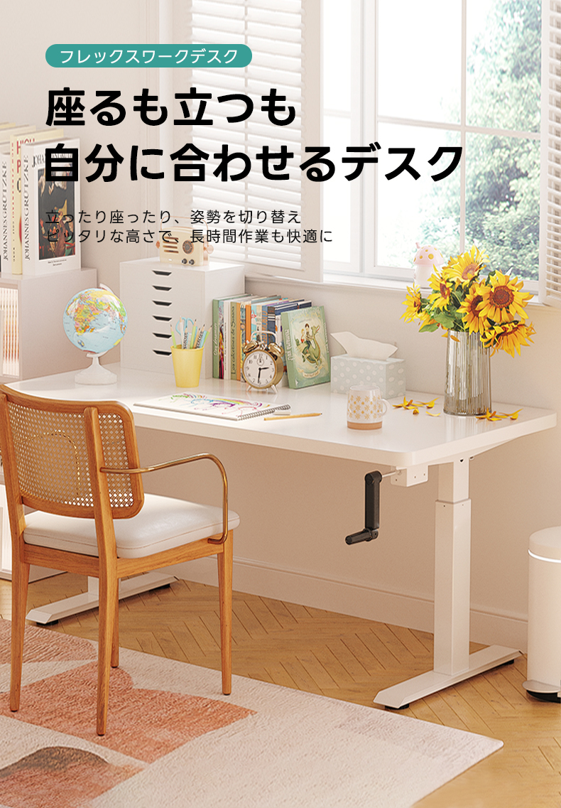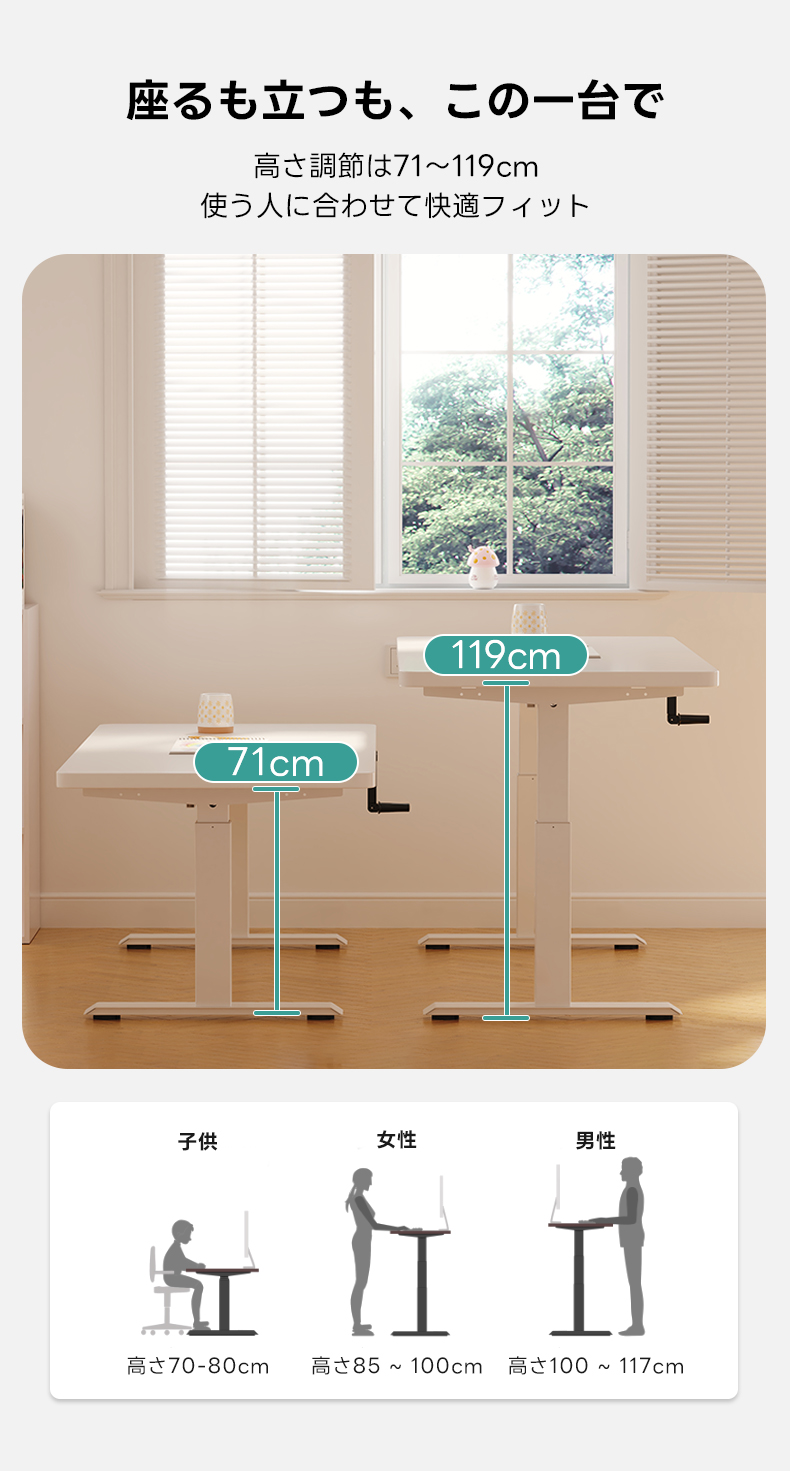 - 【高さ調節機能で快適作業】:フレックス昇降式ワークデスクは、71cmから119cmまでの高さ調節が可能で、座っても立っても快適に作業できます。子供から大人まで、使用者に合わせてフィットし、長時間の作業でも疲れにくい設計です。