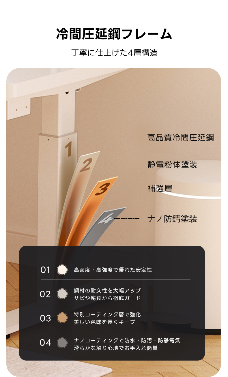 - 【高品質な材料とデザイン】:合成板を使用し、環境にも優しいE1積層合板を採用。冷間圧延鋼フレームは高密度で高強度、安定性抜群です。特別なコーティングで防水・防汚・防静電気加工が施されています。