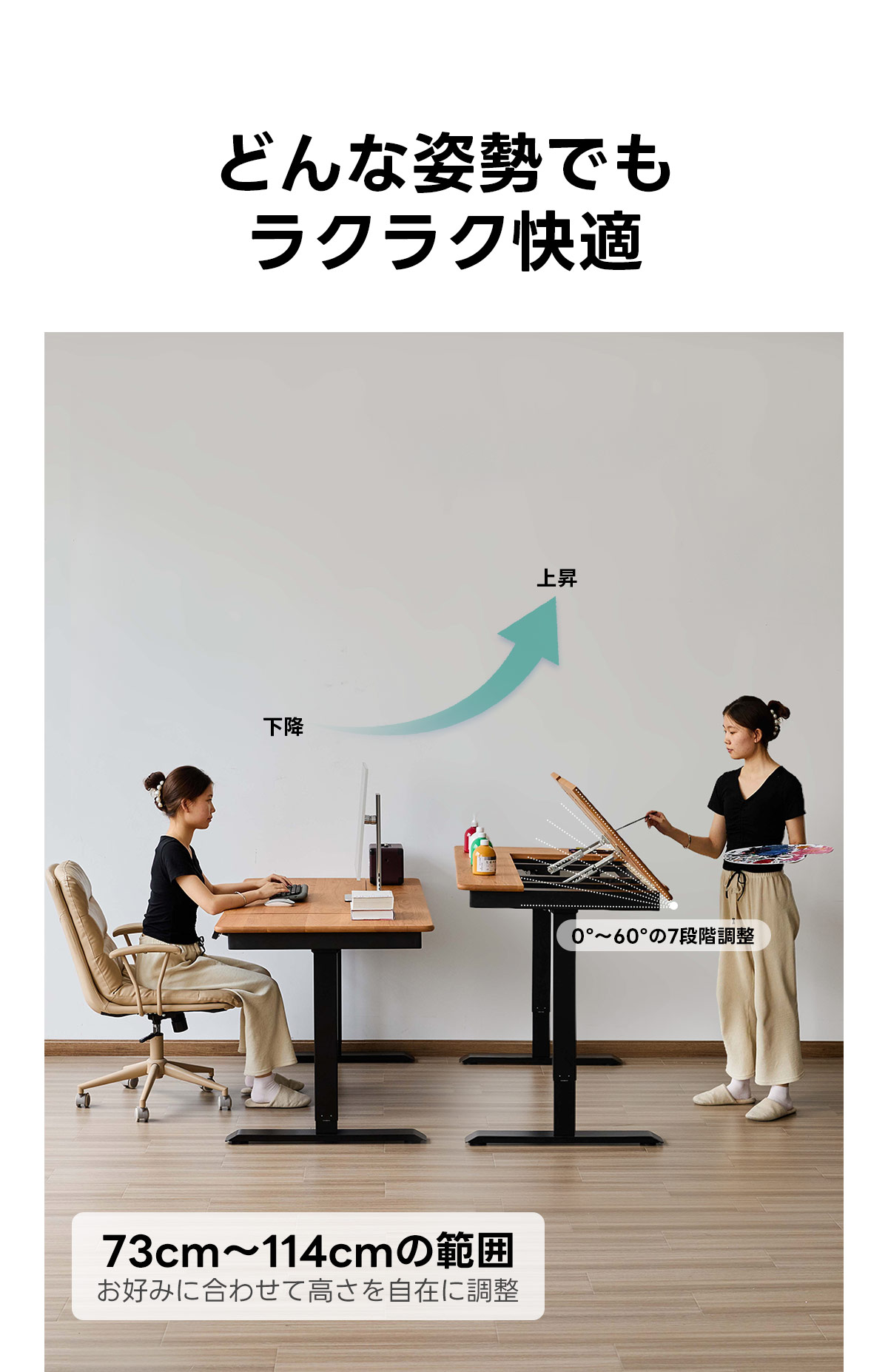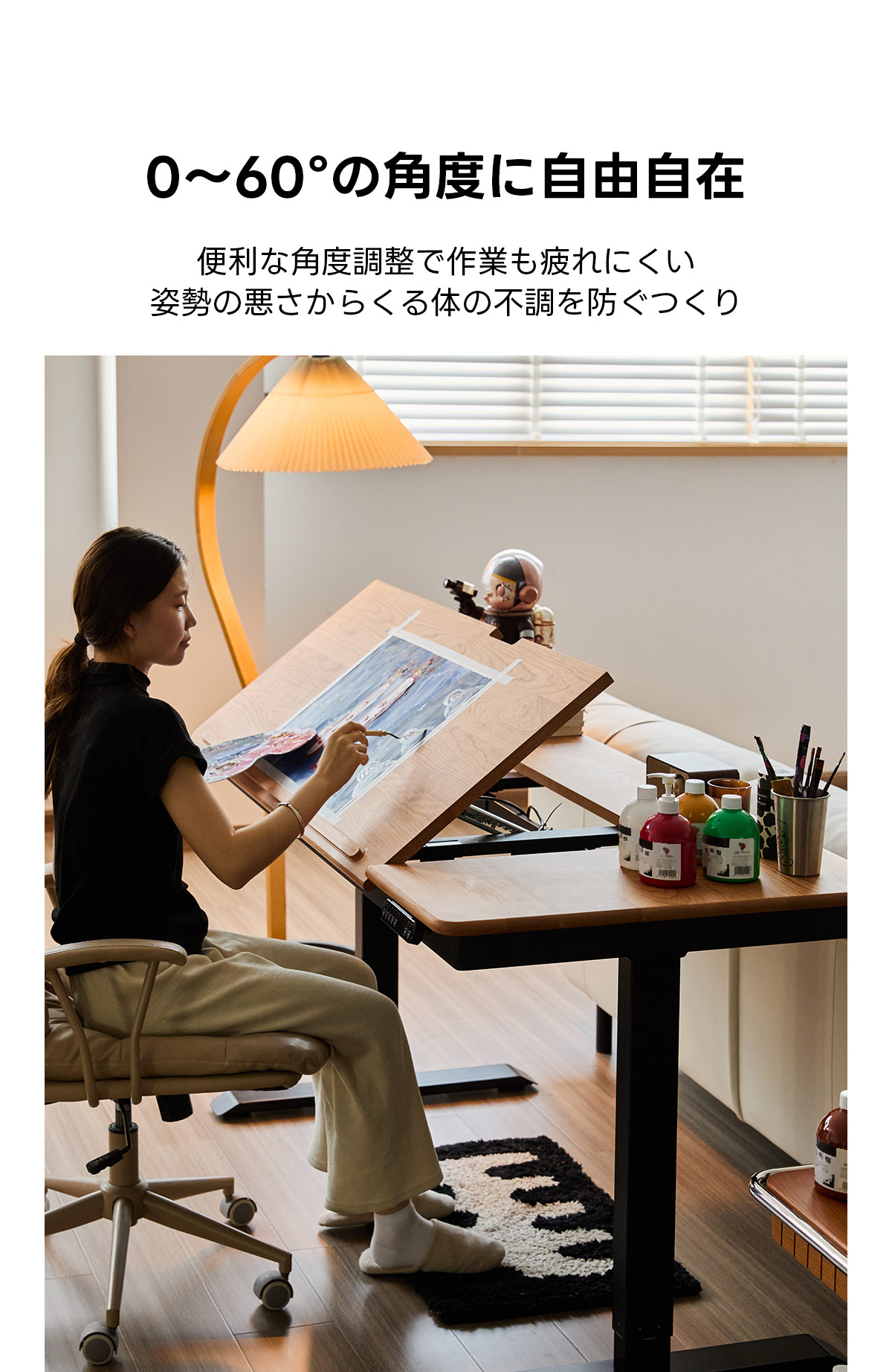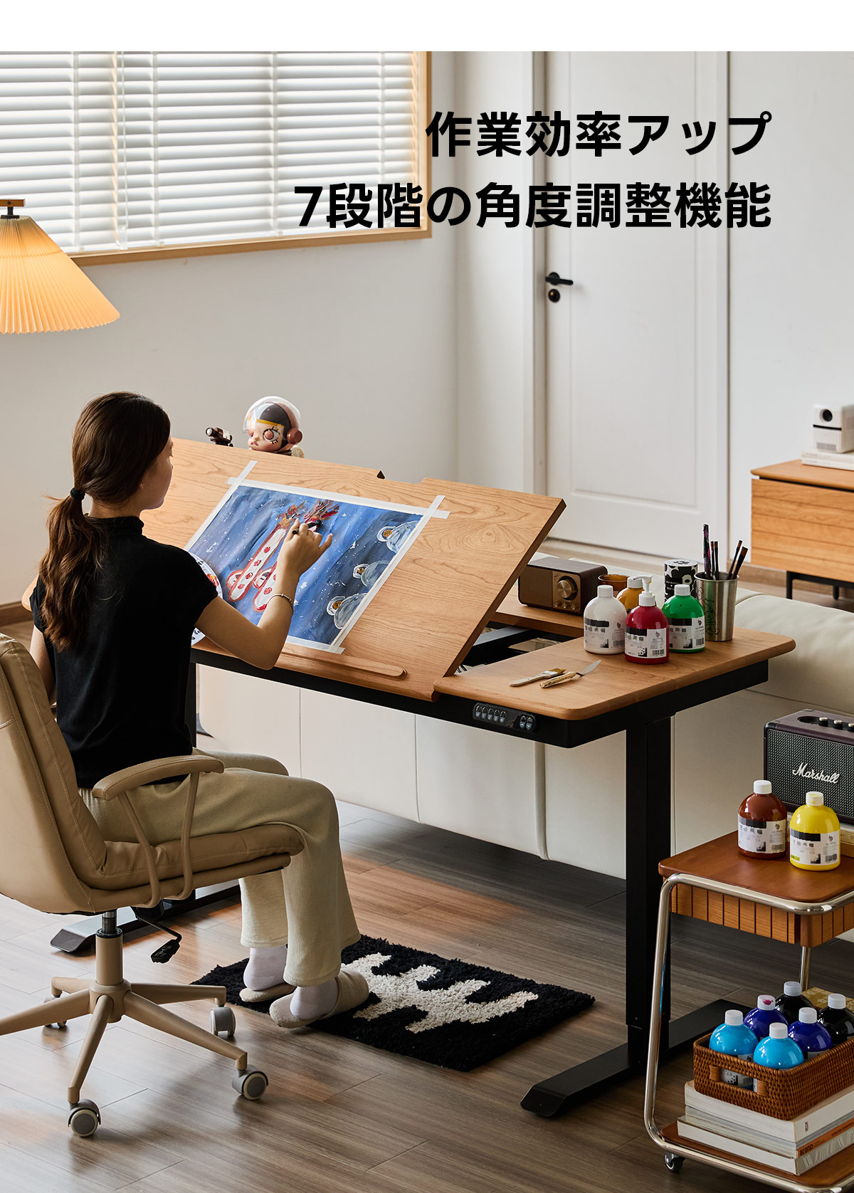 - 【ユーザーに優しい機能】:0°から60°までの7段階の角度調整が可能で、書く、読む、作業するなど、さまざまな用途に対応。メモリー機能でよく使用する高さを4つまで記憶でき、ワンタッチで素早く調整可能です。