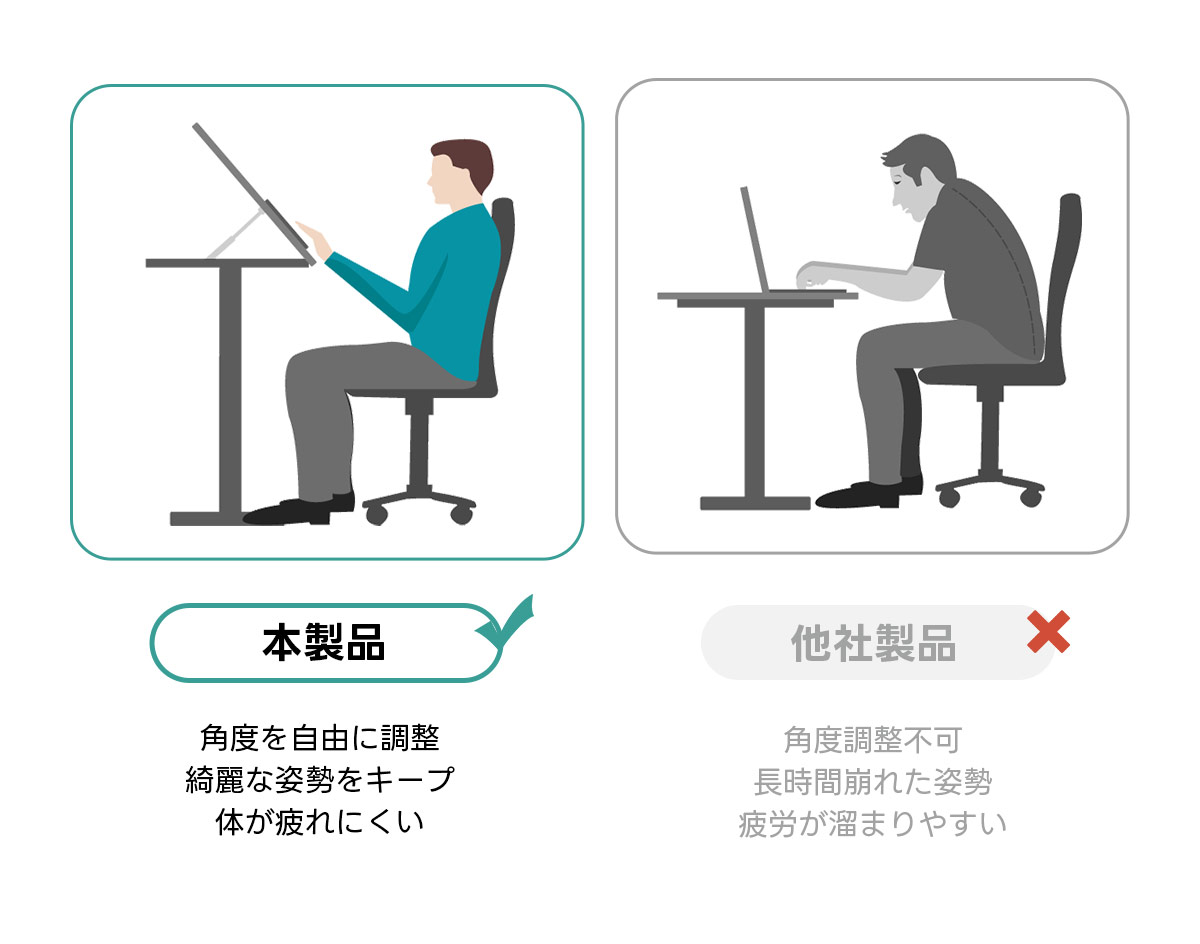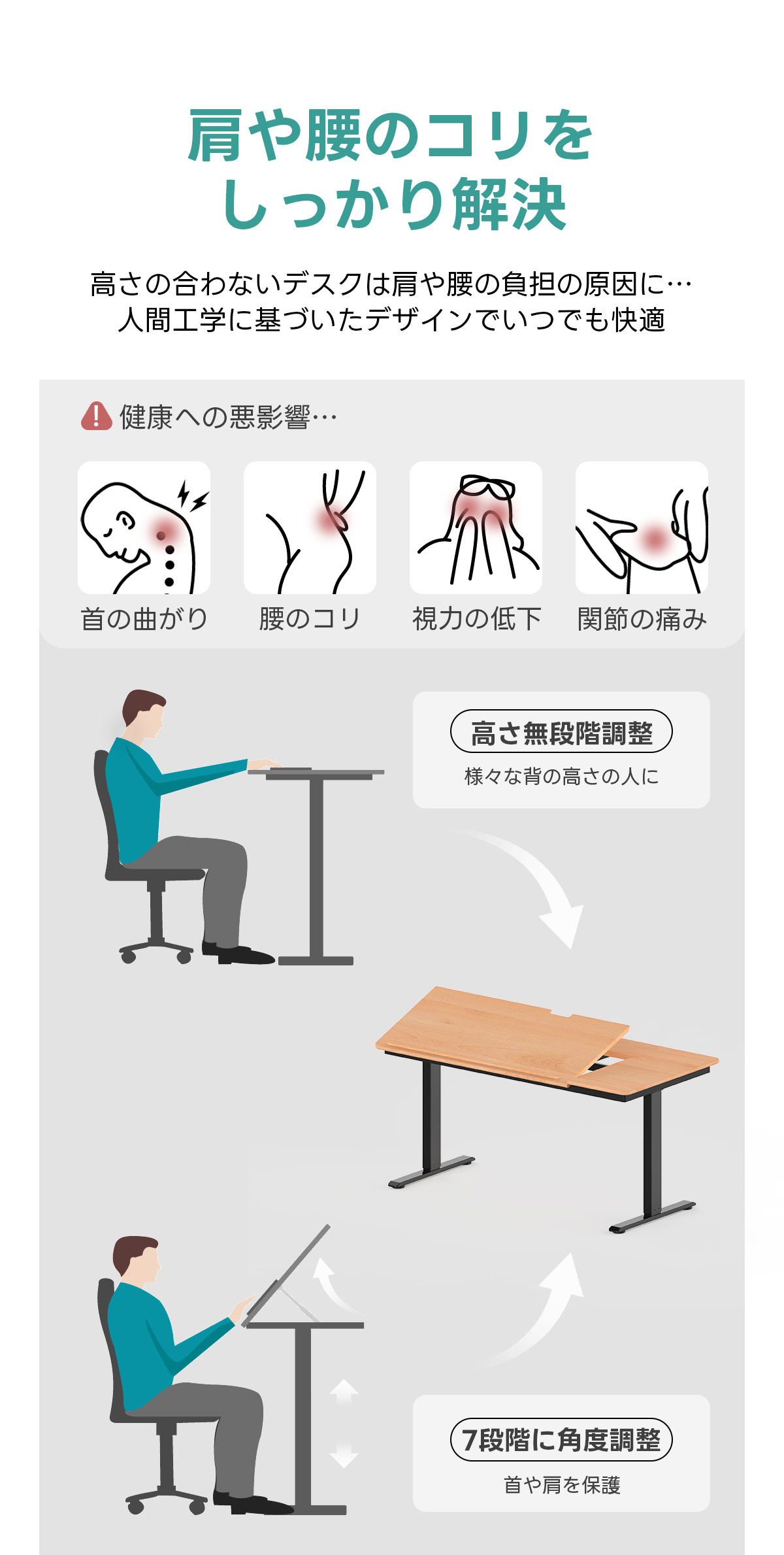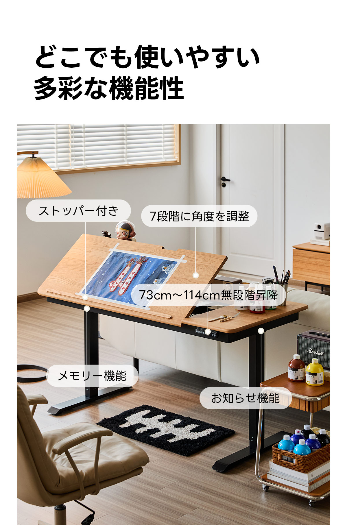 - 【ユーザーに優しい機能】:0°から60°までの7段階の角度調整が可能で、書く、読む、作業するなど、さまざまな用途に対応。メモリー機能でよく使用する高さを4つまで記憶でき、ワンタッチで素早く調整可能です。