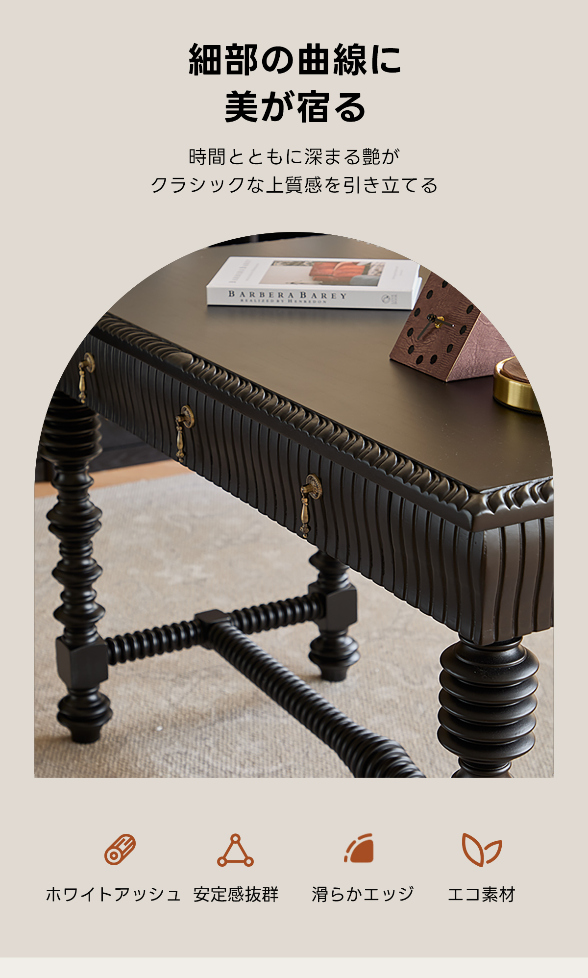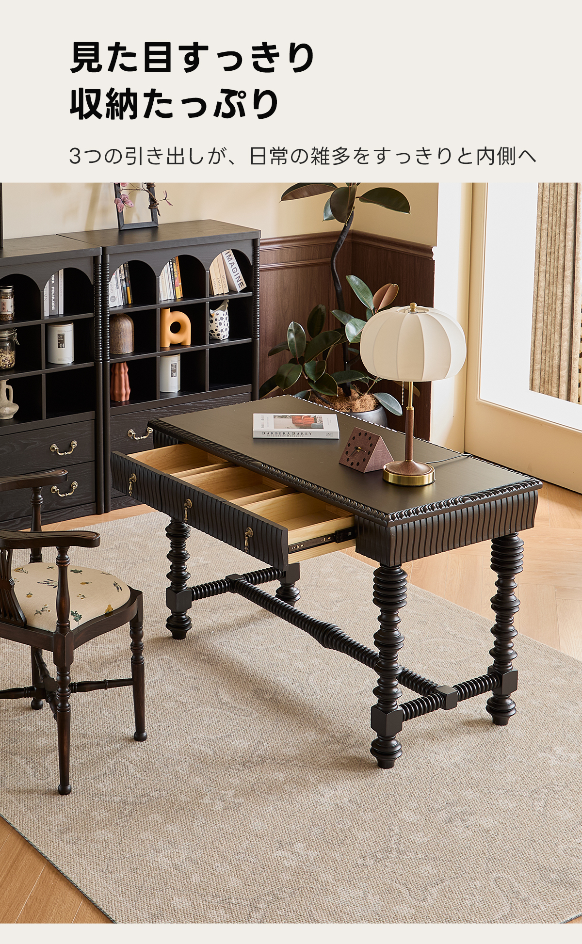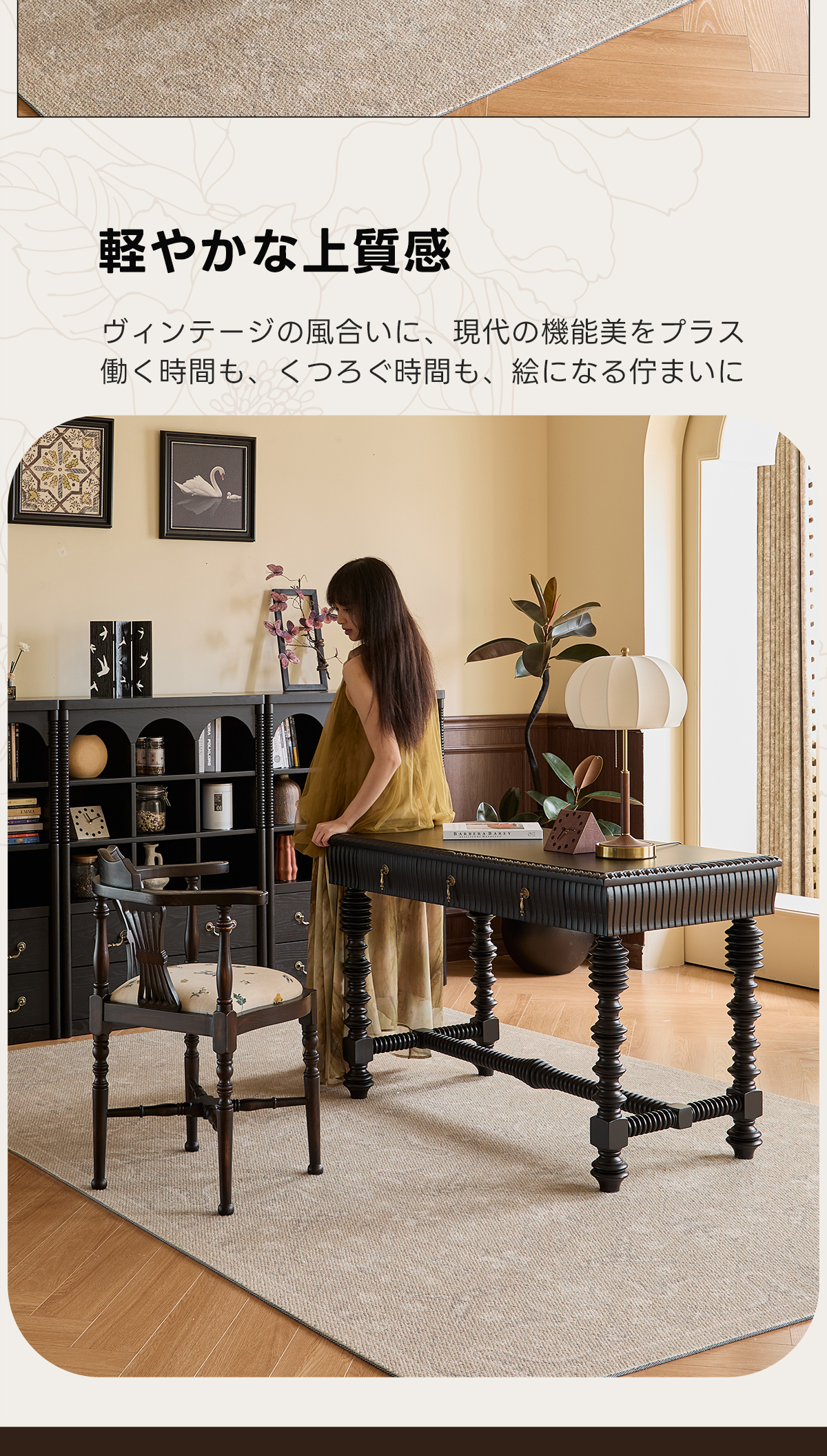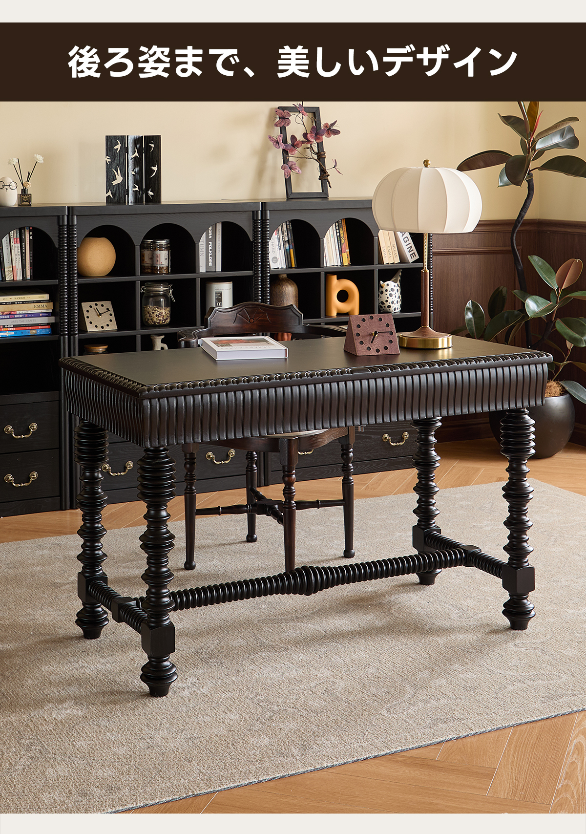 - 【クラシックデザインと現代の機能性】このデスクはクラシックなデザインと現代の機能性を兼ね備え、洗練された曲線と細部の美しさが際立ちます。ブラックの木材を使用し、どんなインテリアにも調和します。