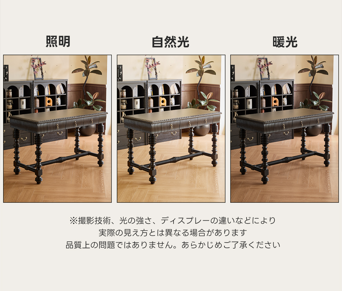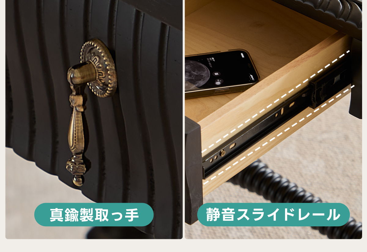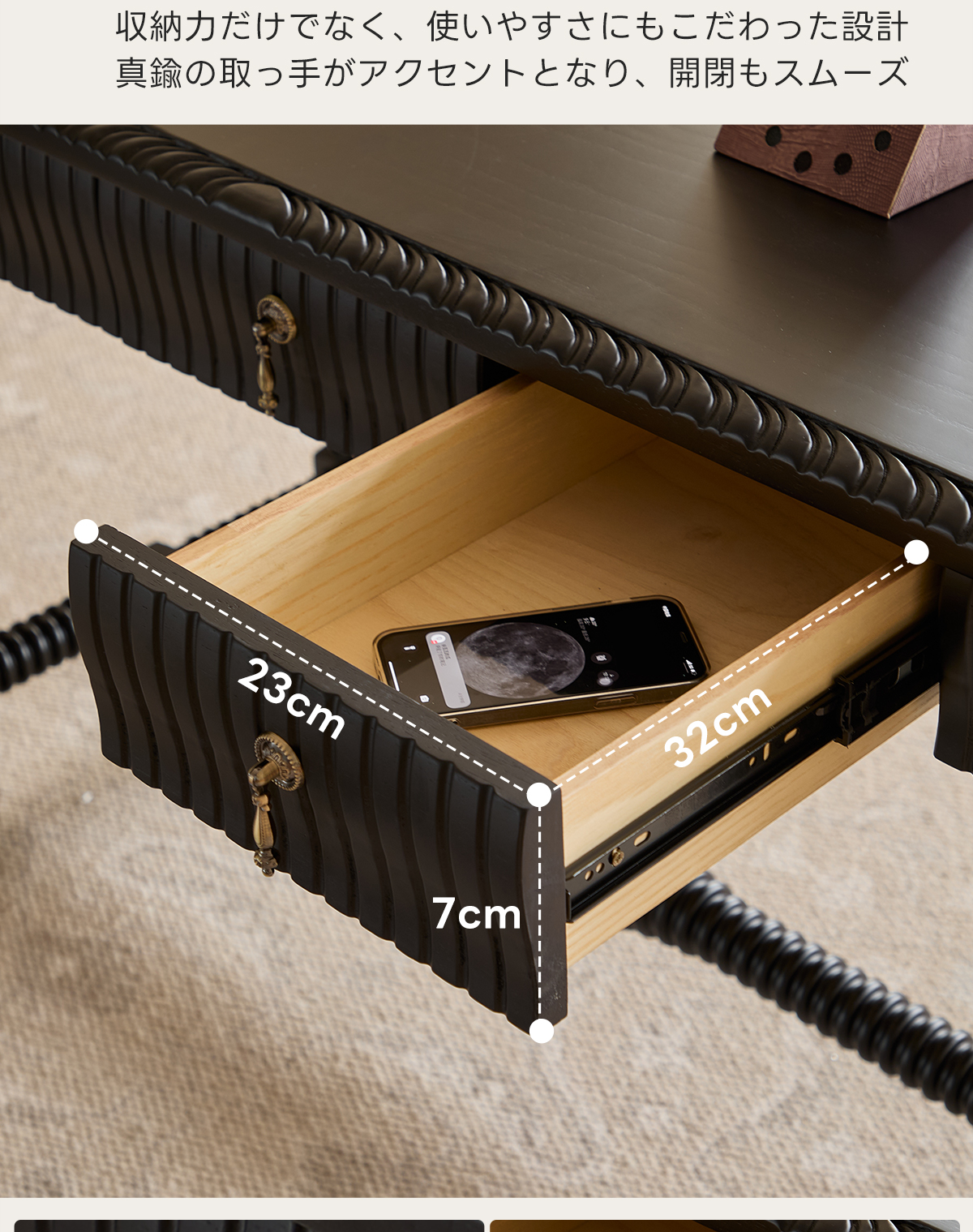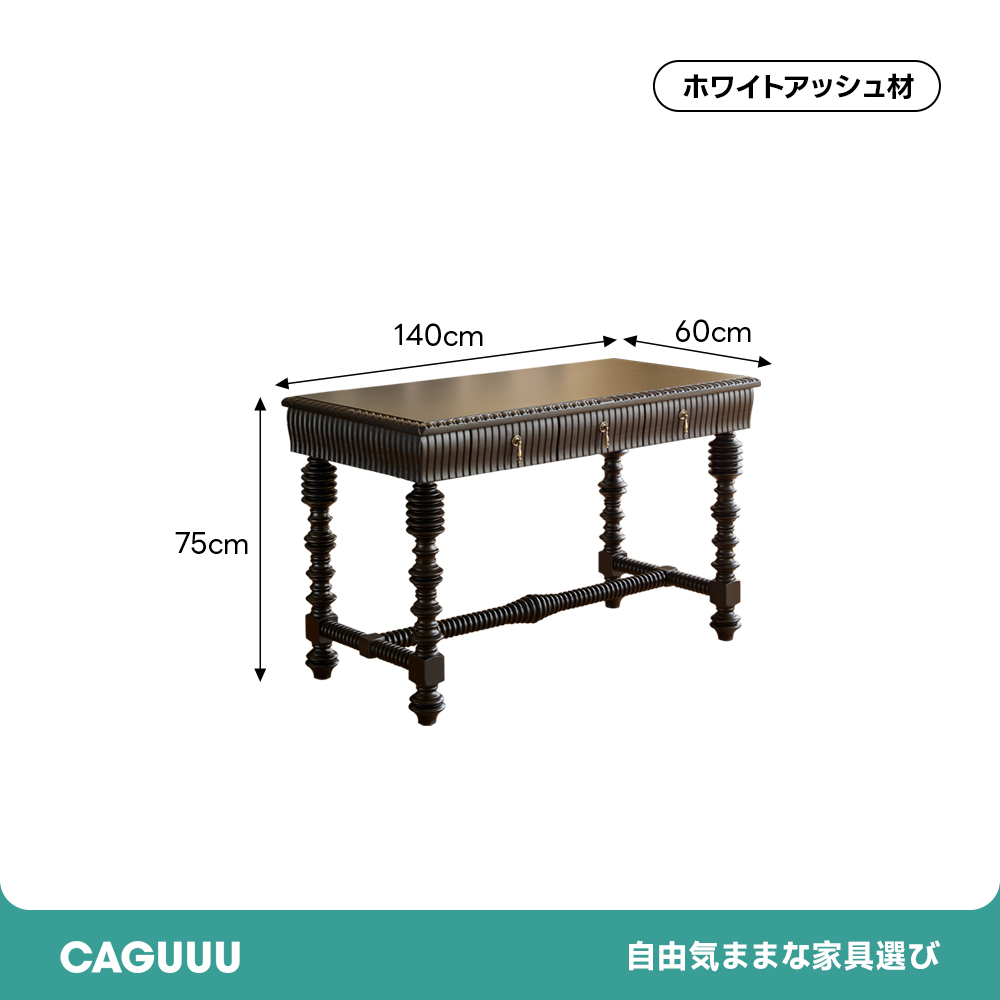 - 【快適な使用体験】幅広い天板が作業スペースを広げ、アイデアを膨らませます。3つの引き出しは日常の雑多なアイテムをすっきりと収納でき、真鍮製の取っ手がアクセントとなっています。