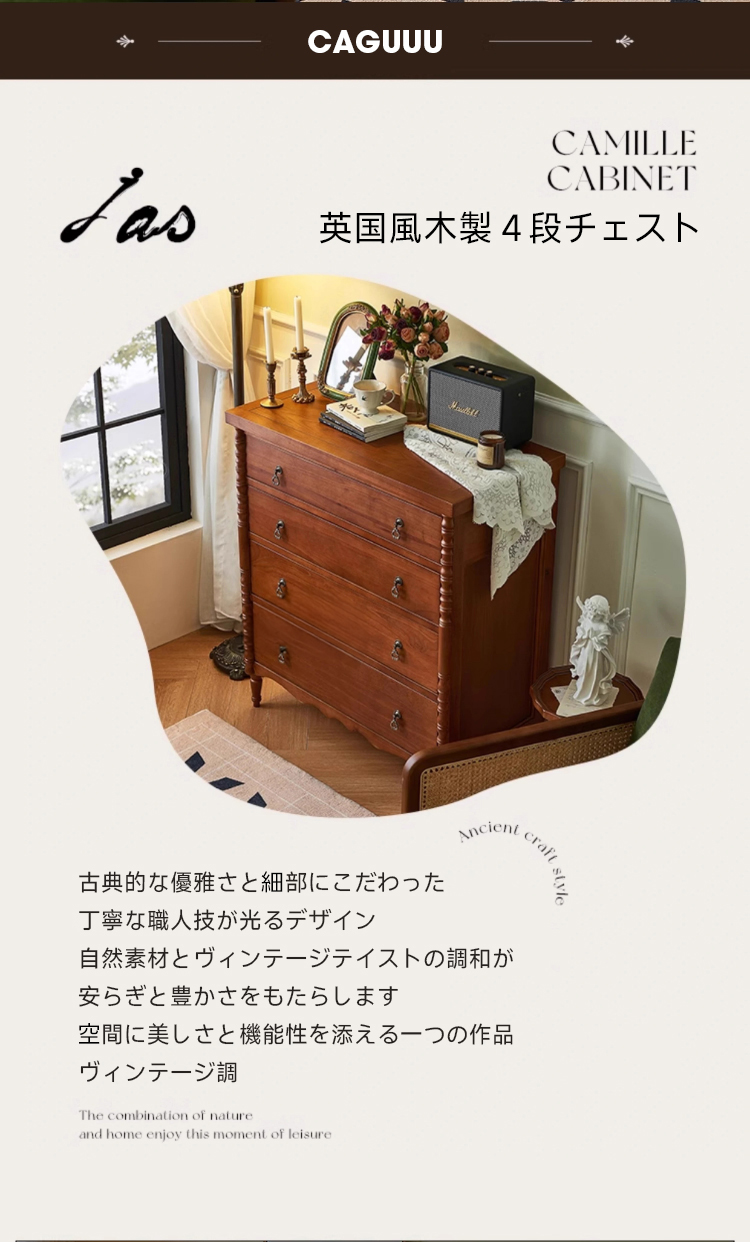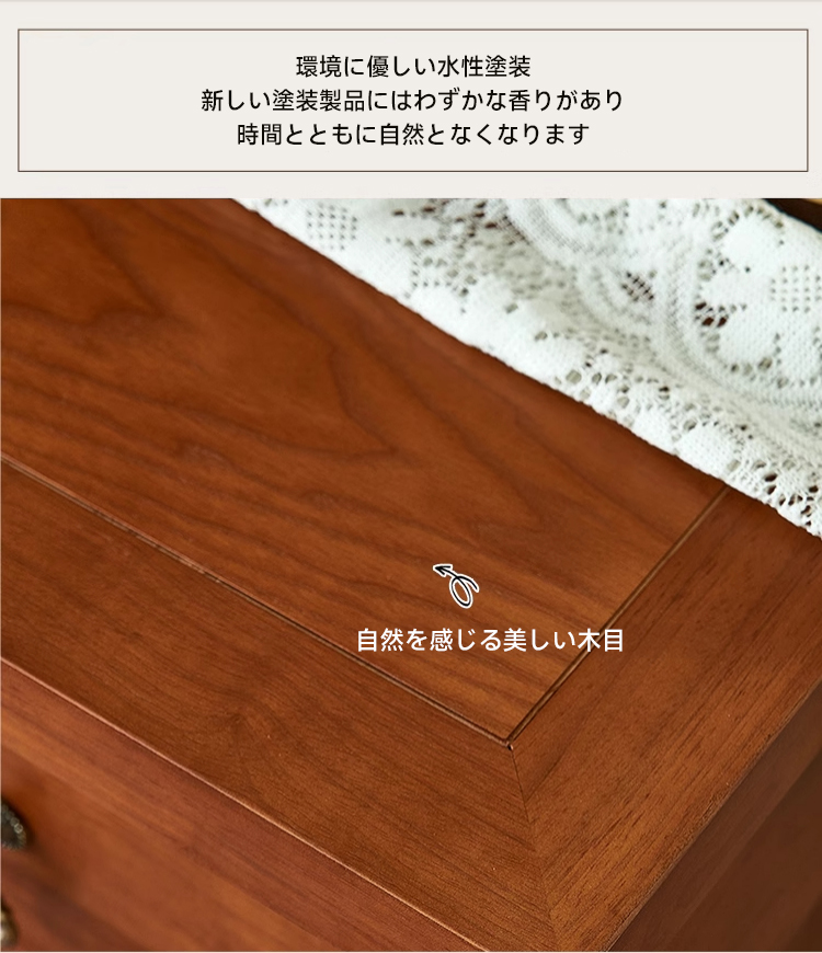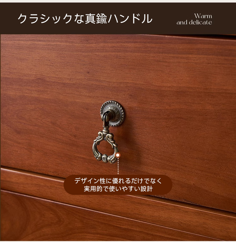 - 【高品質な素材とデザイン】輸入ラバーウッドと天然木材合板を使用し、自然の息吹を感じる美しい木目が魅力です。クラシックな真鍮ハンドルがエレガントな雰囲気を演出します。