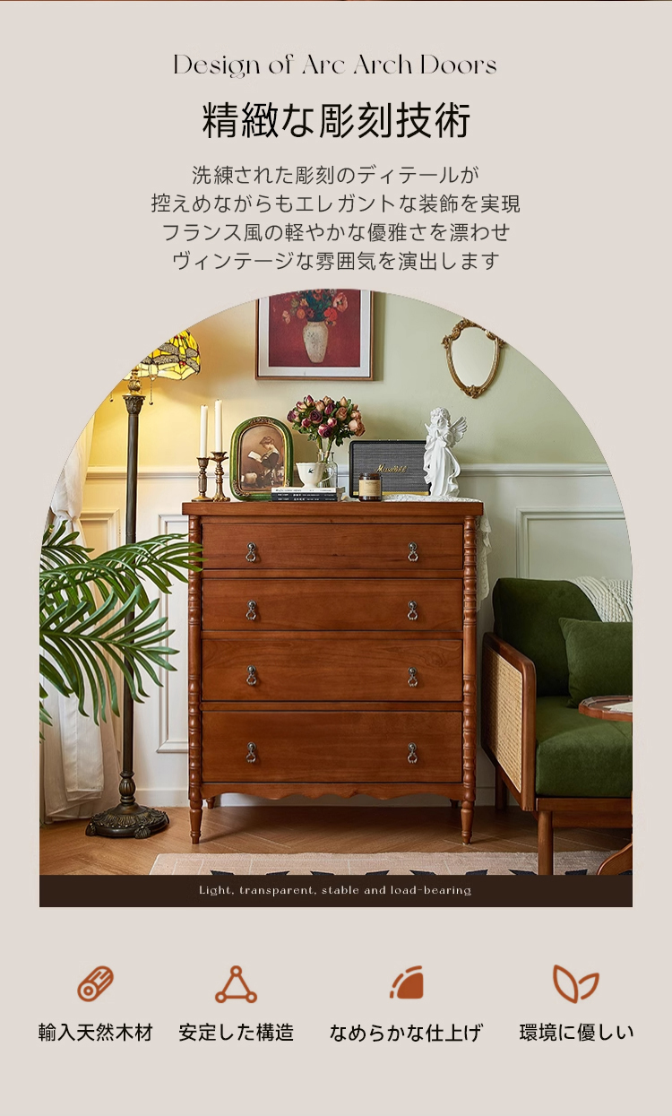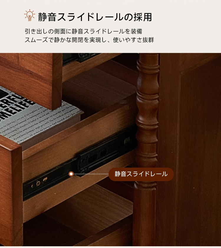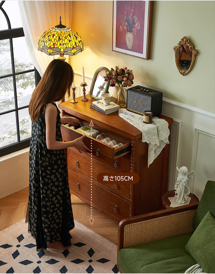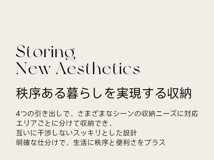 - 【多機能収納スペース】4つの引き出しを備えたこのチェストは、静音スライドレールを採用しており、スムーズで静かな開閉が可能です。リビングや寝室での多様な収納ニーズに応えます。