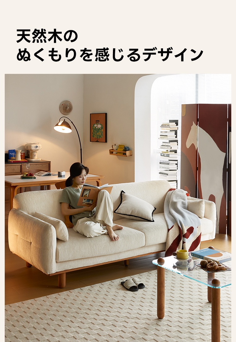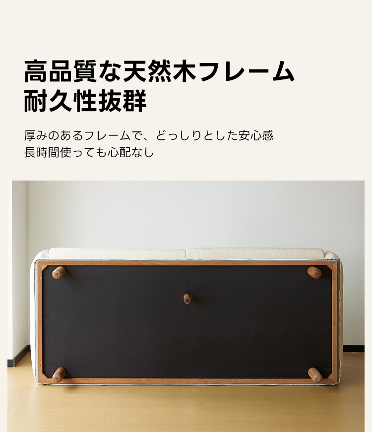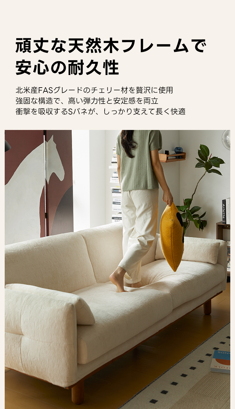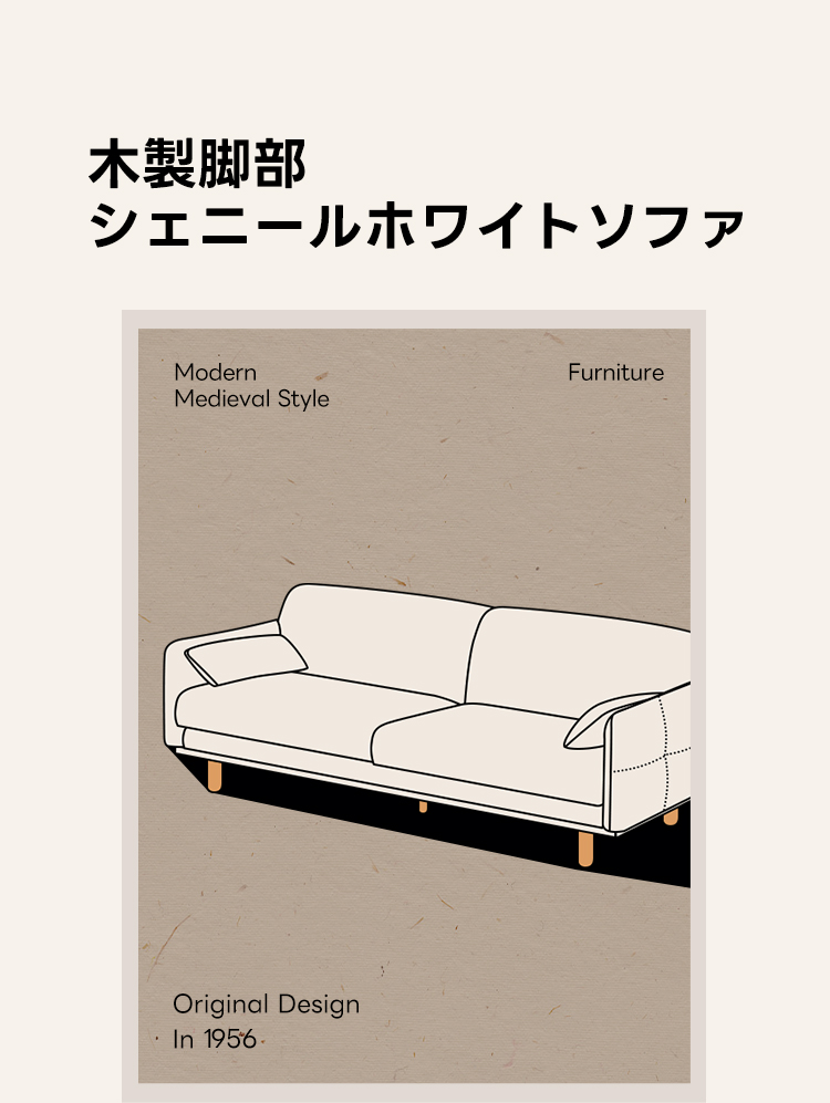 チェリー材 木製脚部 シェニールホワイトソファ【カスタマイズ可】