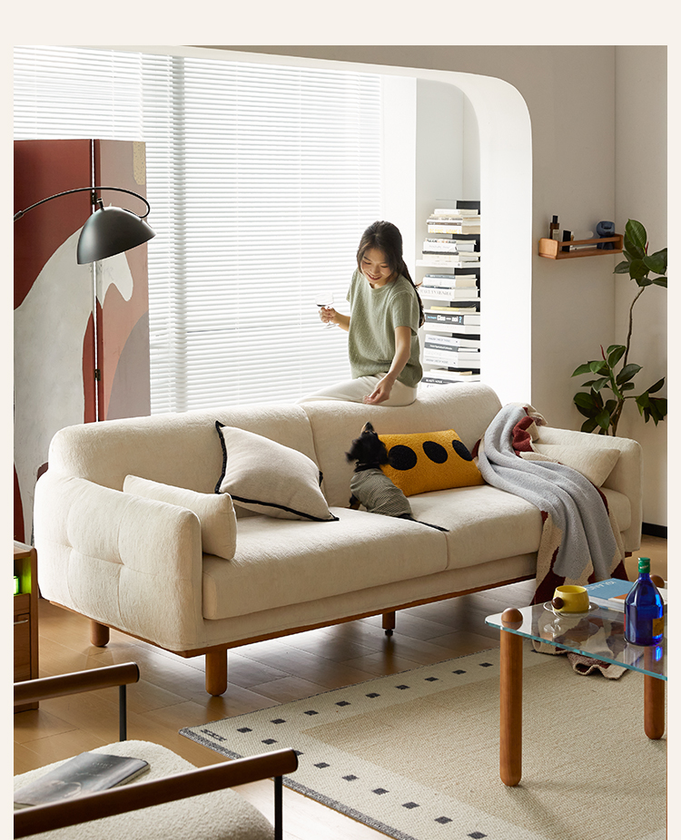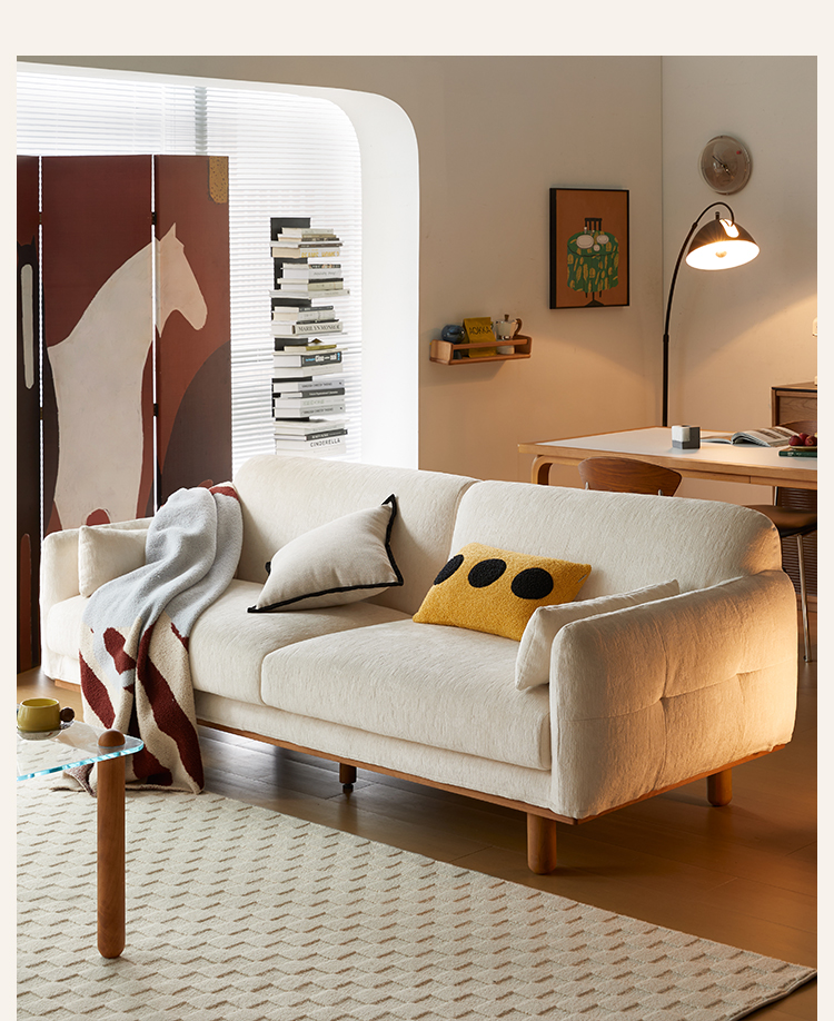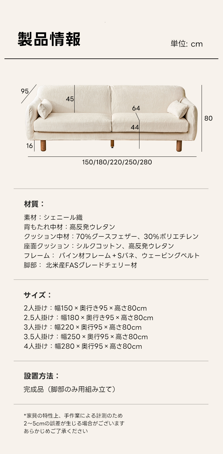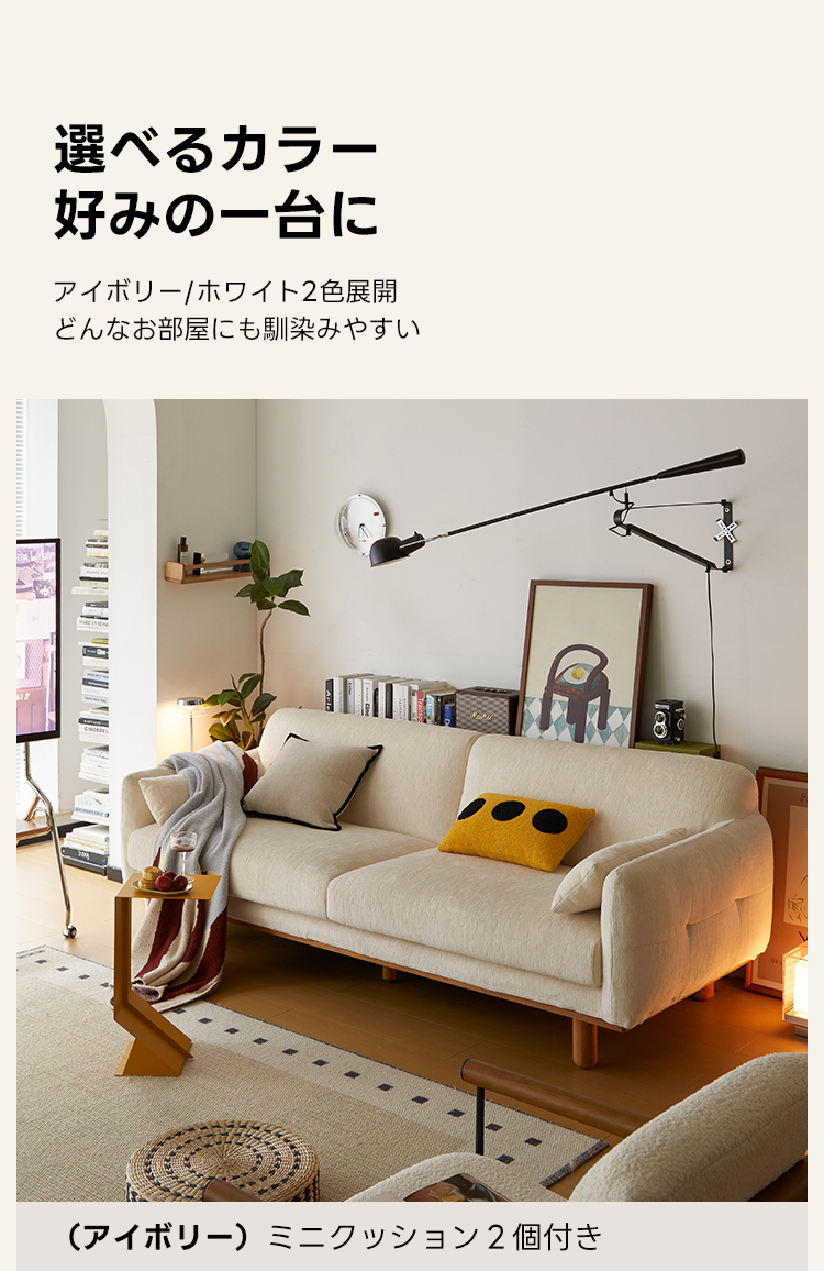 チェリー材 木製脚部 シェニールホワイトソファ【カスタマイズ可】