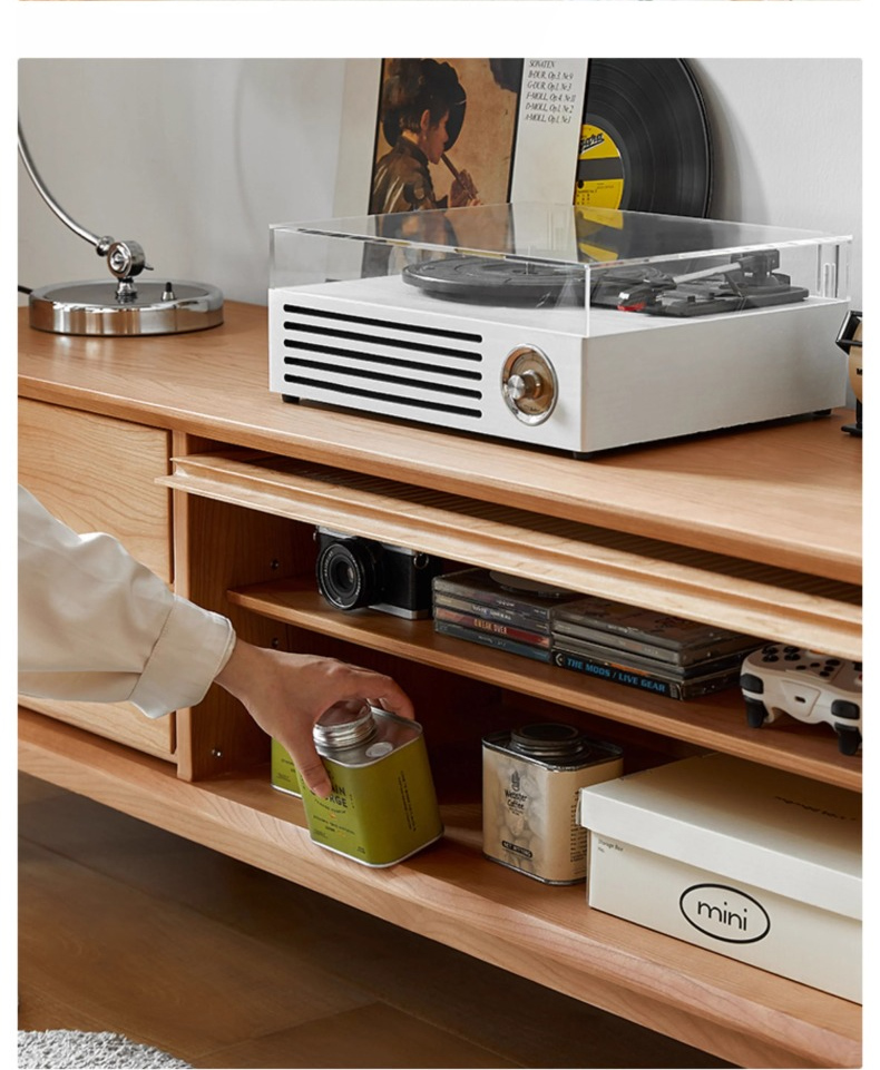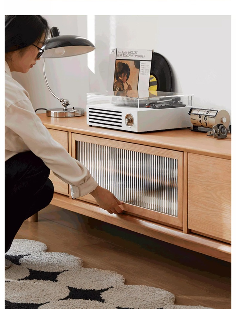 - 【多機能な収納スペース】2段引き出し、スライドドア、フラットドアを備えた3つの収納スペースがあり、さまざまなアイテムを整理整頓できます。特に、リブガラスの扉は、ビデオ機器やディスプレイとしても活用可能です。