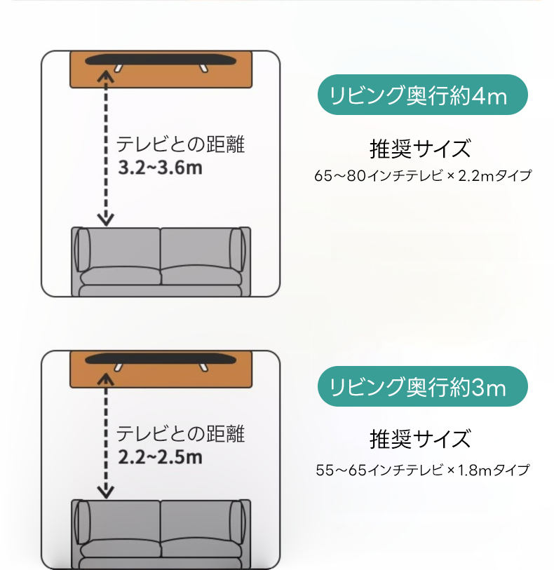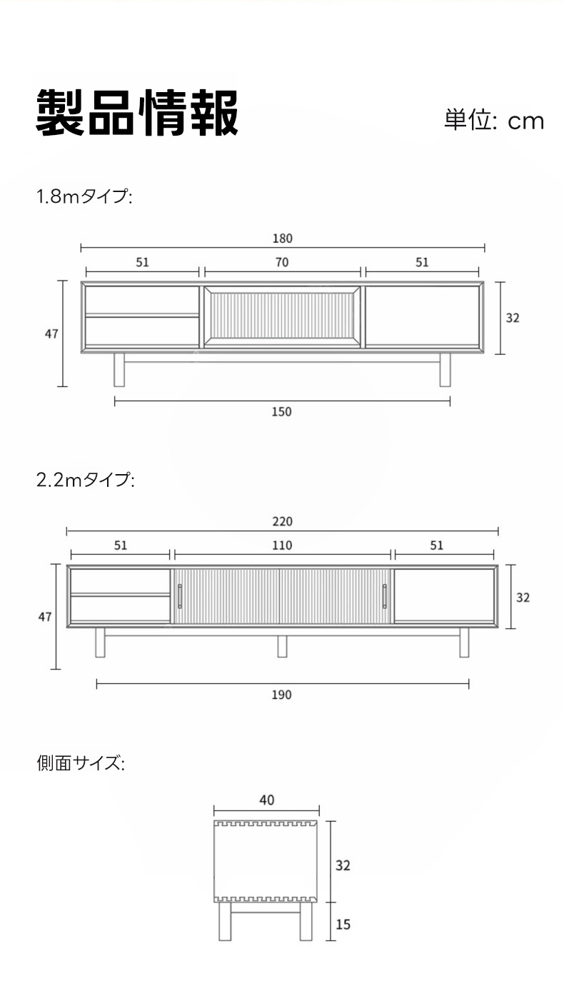 - 【サイズバリエーション】1.8mと2.2mの2種類のサイズがあり、リビングの広さやテレビのサイズに合わせて選べます。1.8mタイプは55〜65インチ、2.2mタイプは65〜75インチのテレビに最適です。