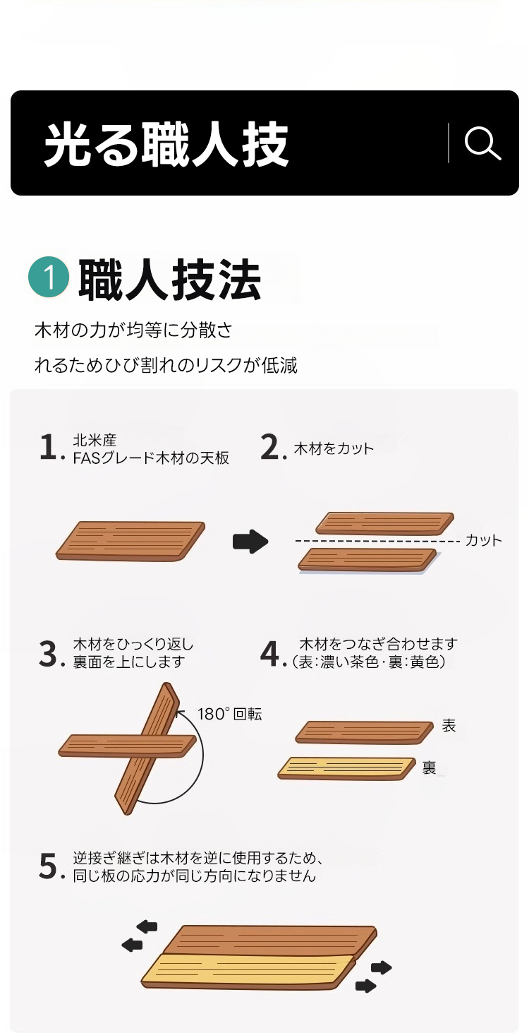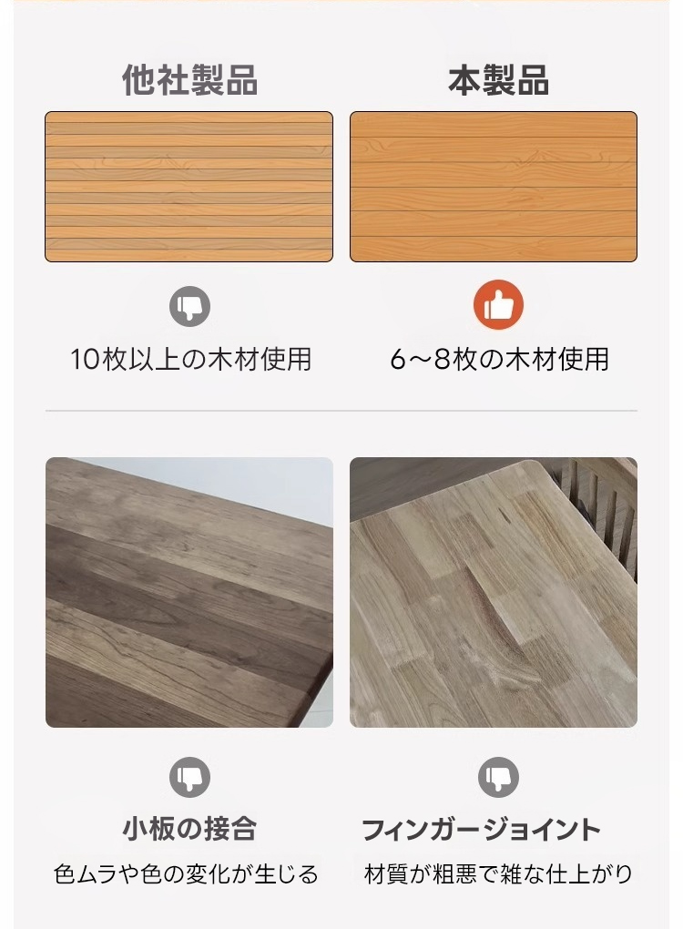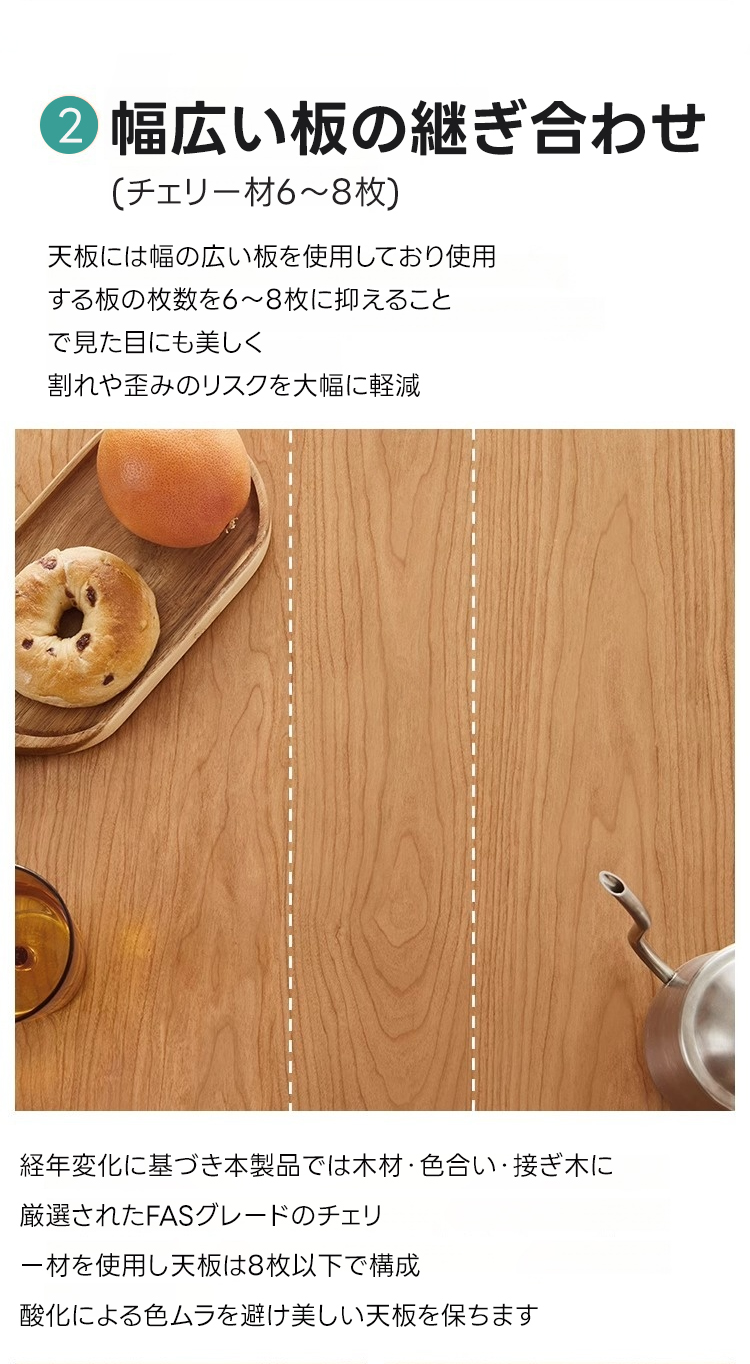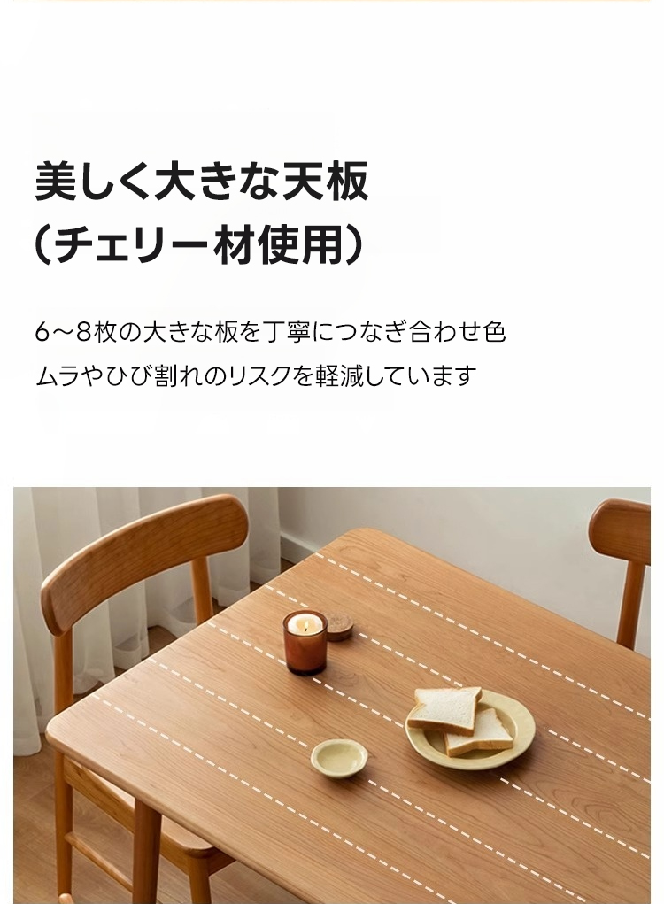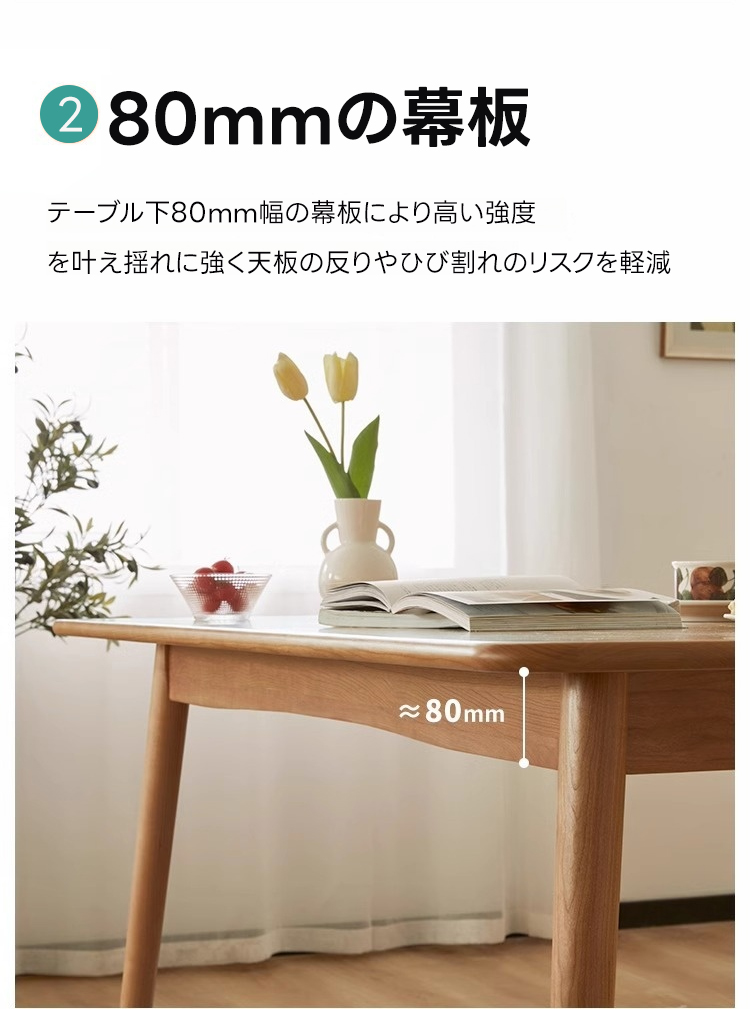 - 【職人技が光るデザイン】6~8枚の広い板を使用し、ひび割れや歪みのリスクを大幅に軽減。手触りも滑らかで、自然な風合いを楽しめます。外開きの脚部デザインと80mmの幕板により、安定感抜群です。