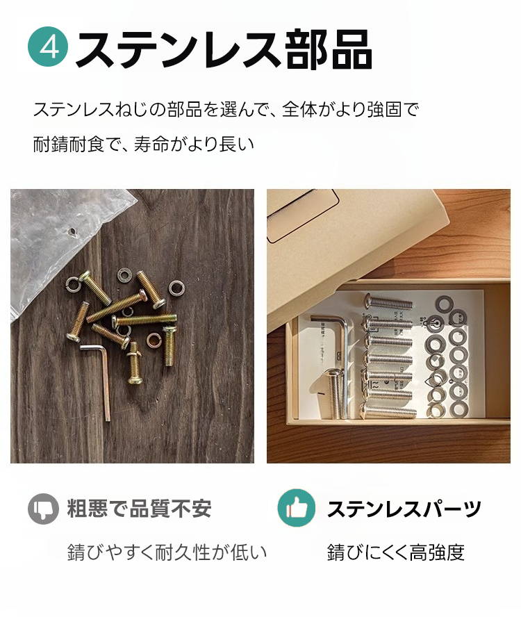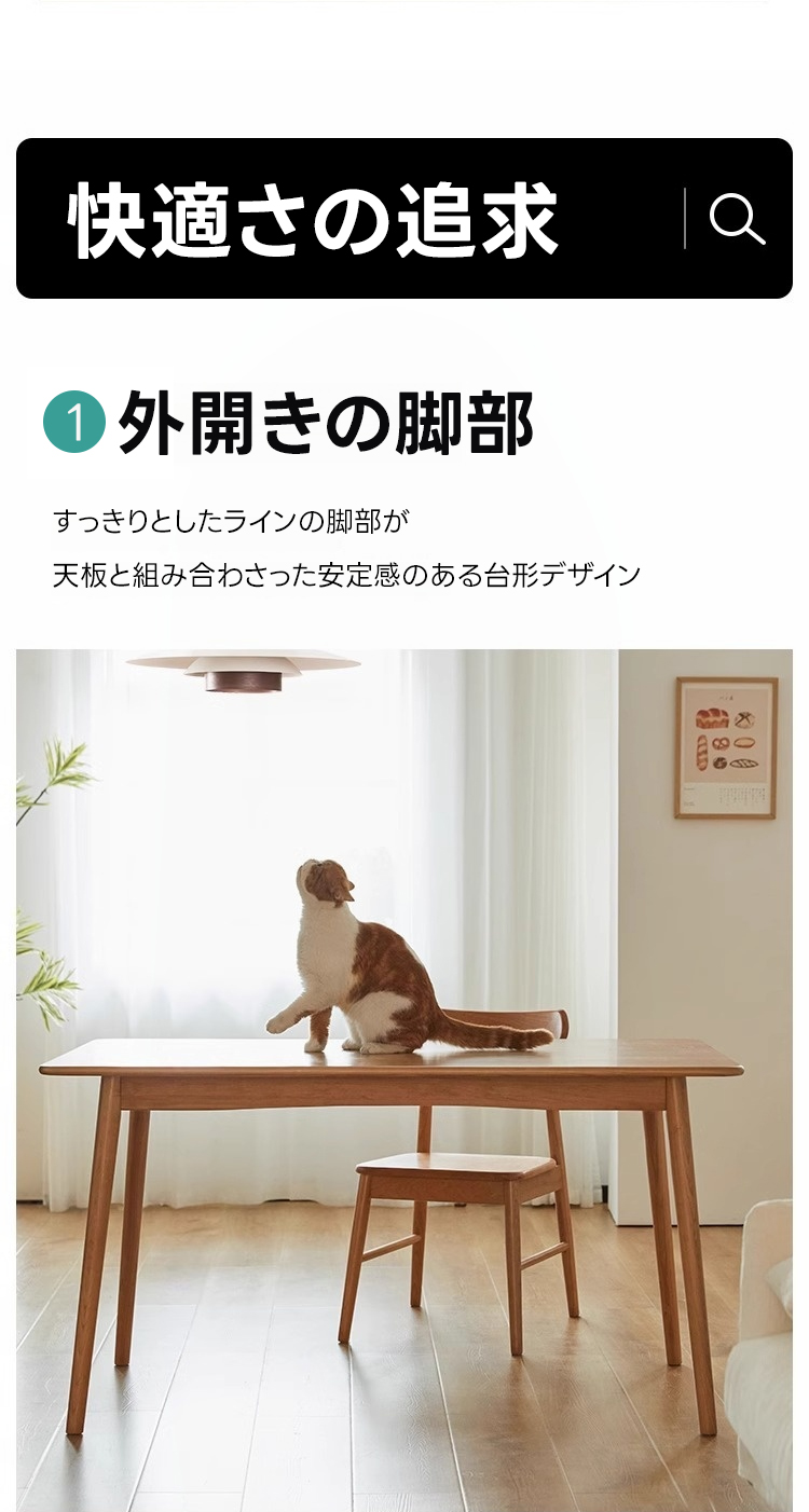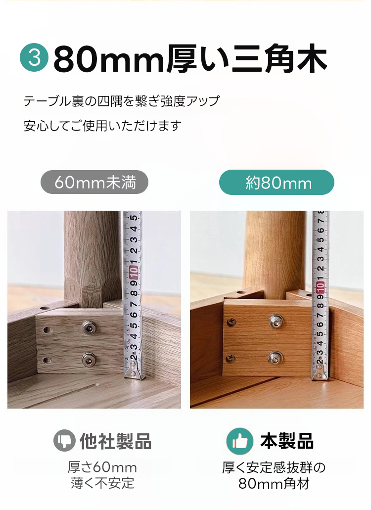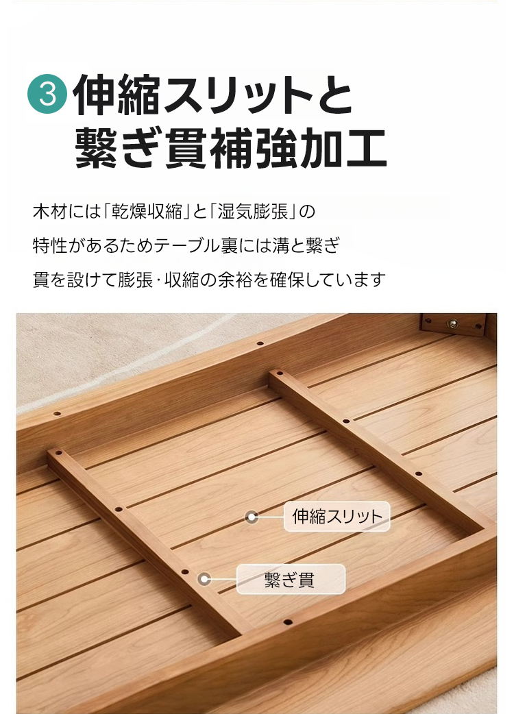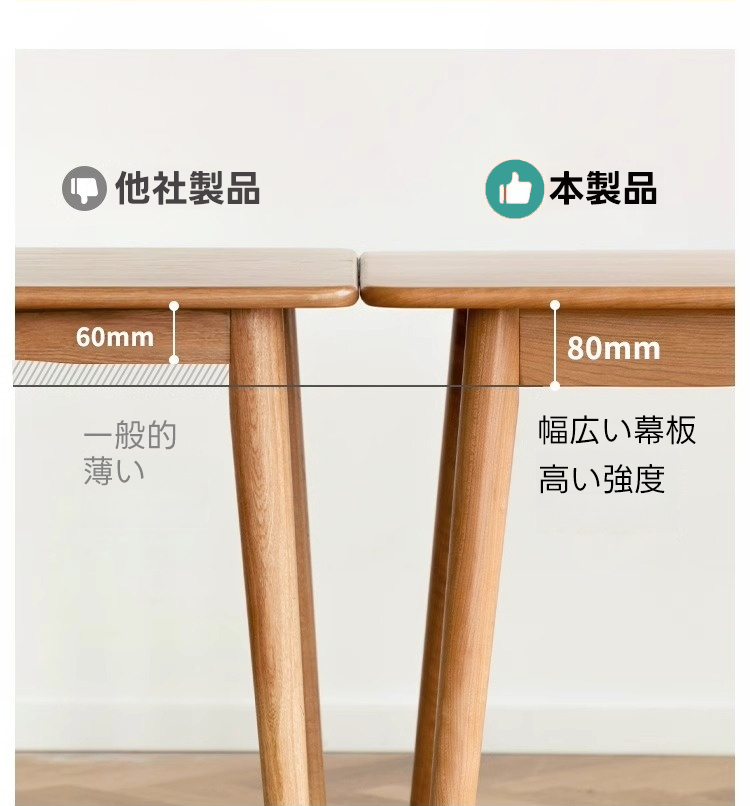 - 【職人技が光るデザイン】6~8枚の広い板を使用し、ひび割れや歪みのリスクを大幅に軽減。手触りも滑らかで、自然な風合いを楽しめます。外開きの脚部デザインと80mmの幕板により、安定感抜群です。