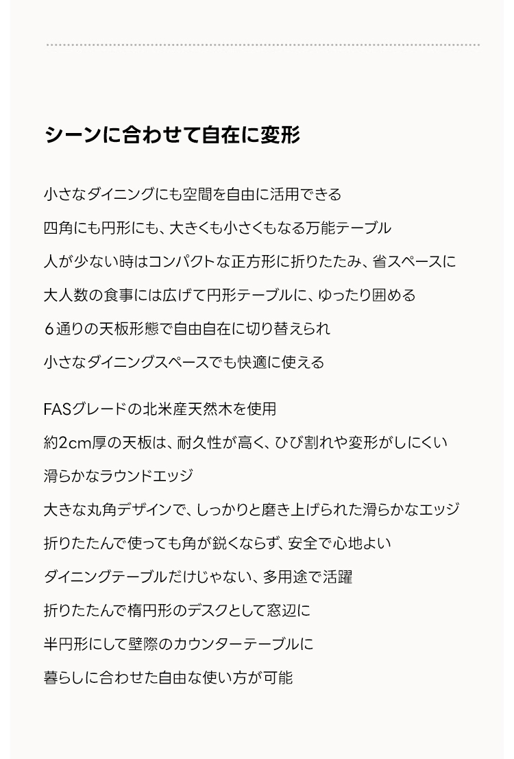 - 【多機能変形テーブル】:このテーブルは丸形、楕円形、半円形、正方形に変形可能で、さまざまな使用シーンに柔軟に対応します。ダイニングルームやリビングルームでの使用に最適で、日常の食事や特別な集まりにぴったりです。