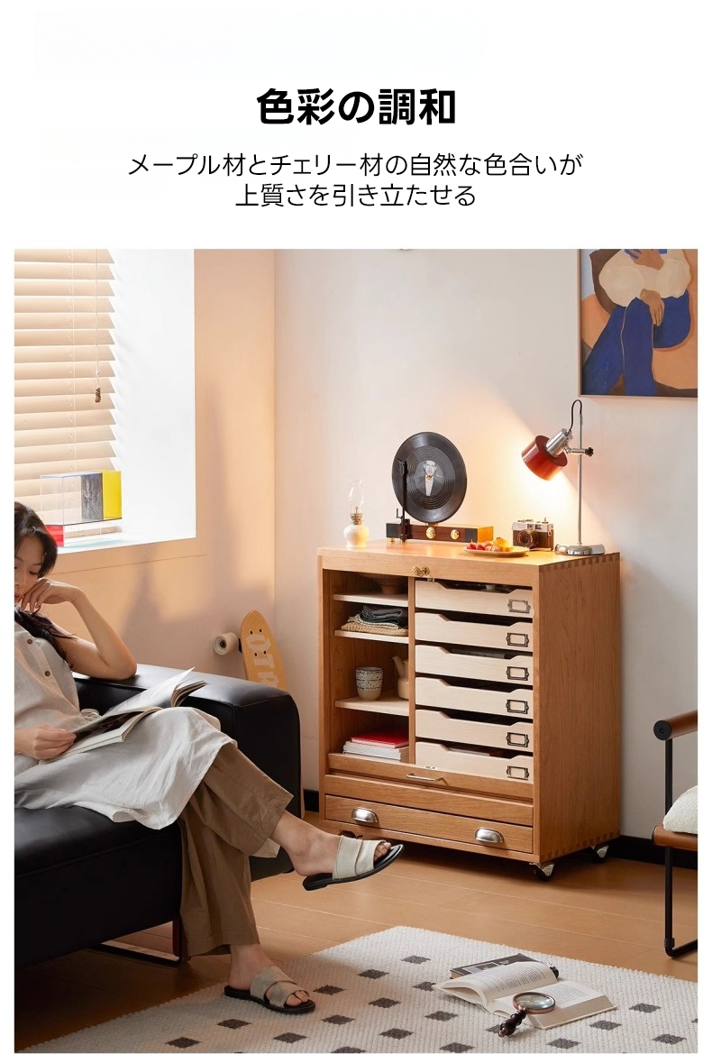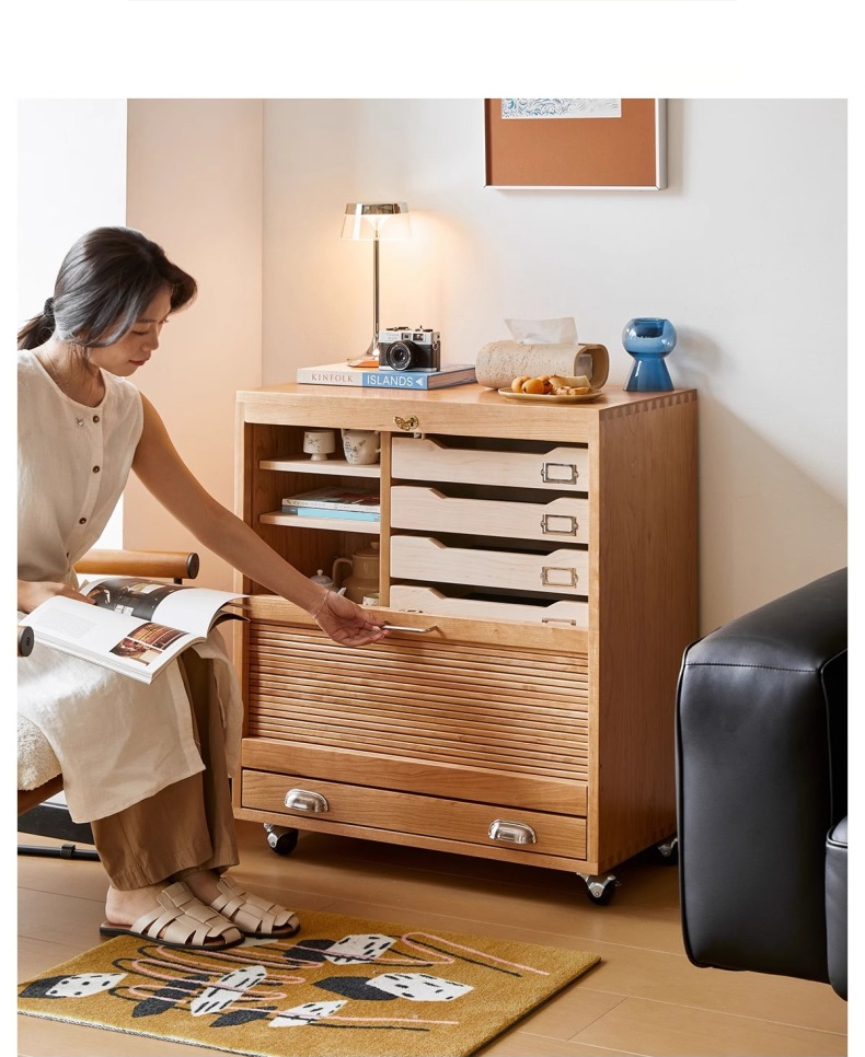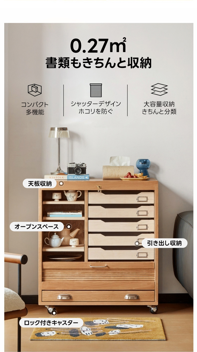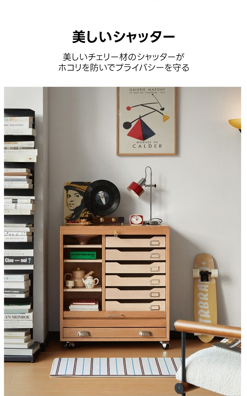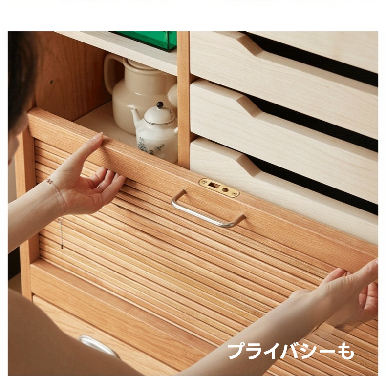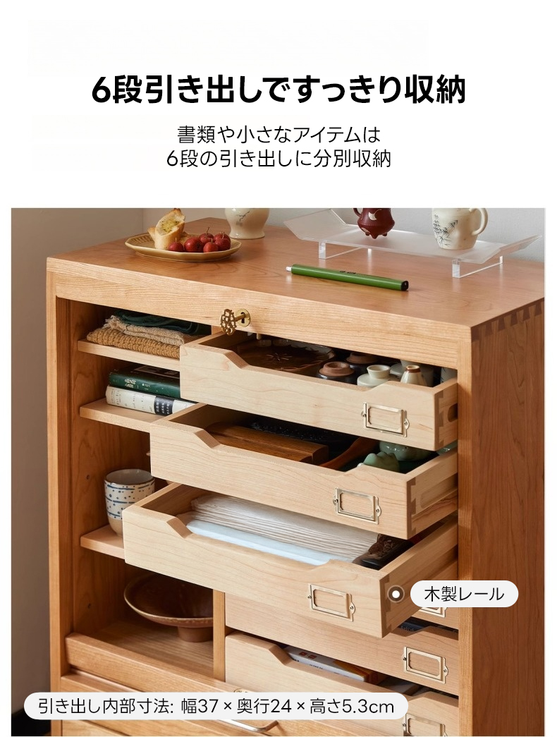 - 【多機能収納キャビネット】このチェリー材シャッター式キャビネットは、6段の引き出しとオープンスペースを備え、書類や小物を効率的に整理できます。シャッター式扉により、ほこりを防ぎプライバシーを守ります。