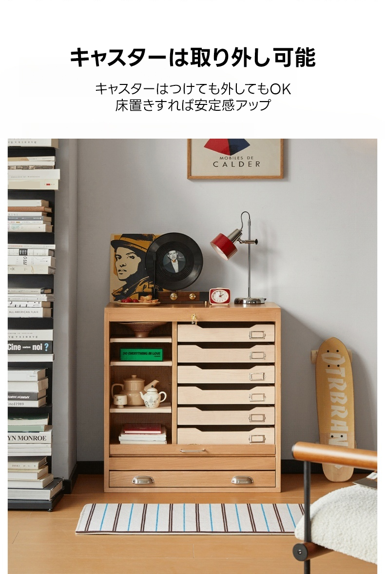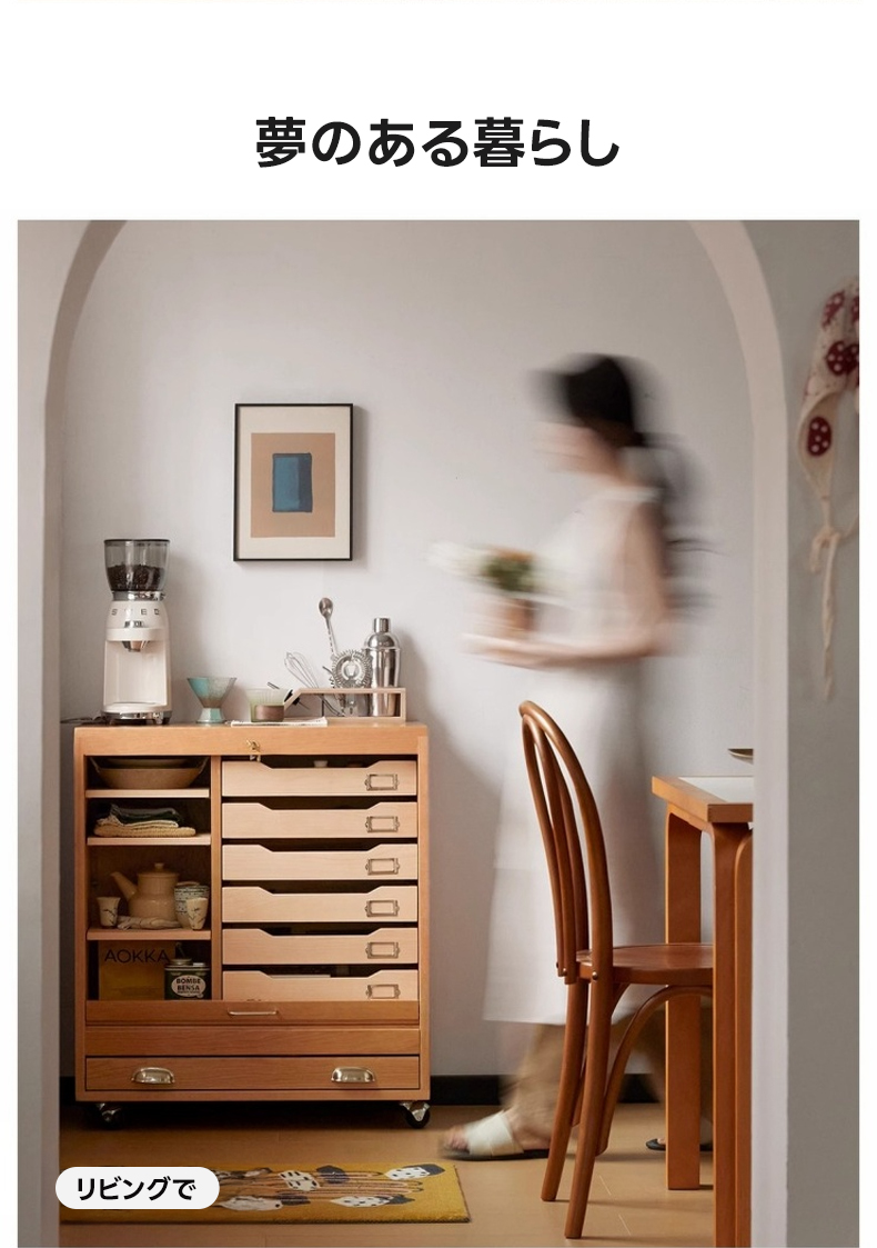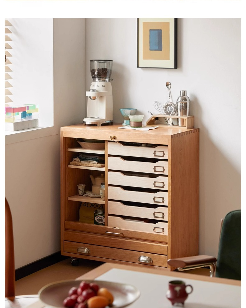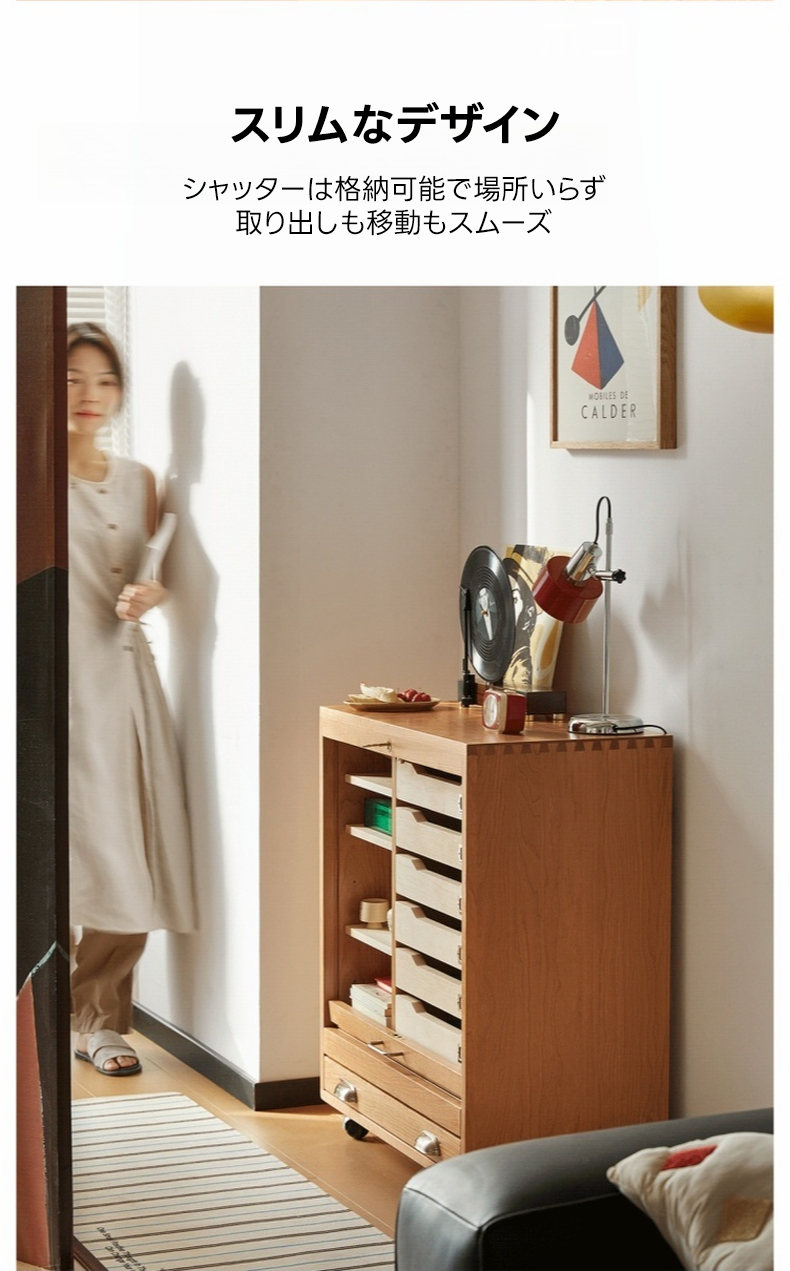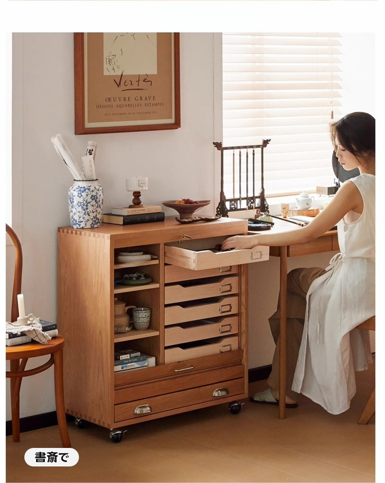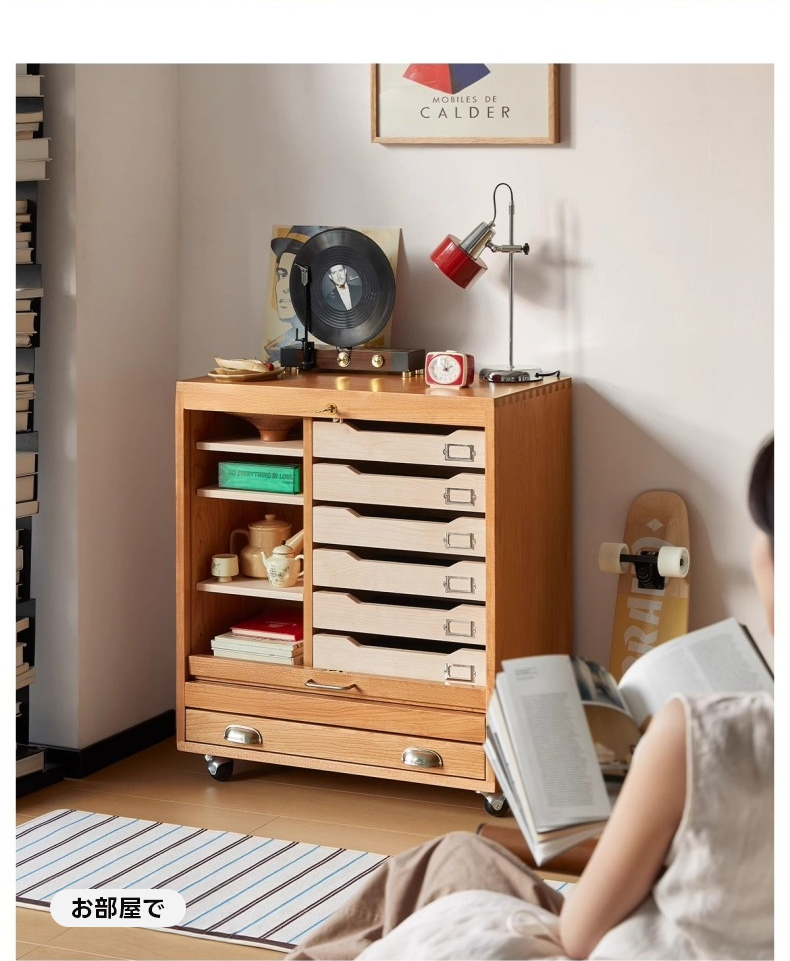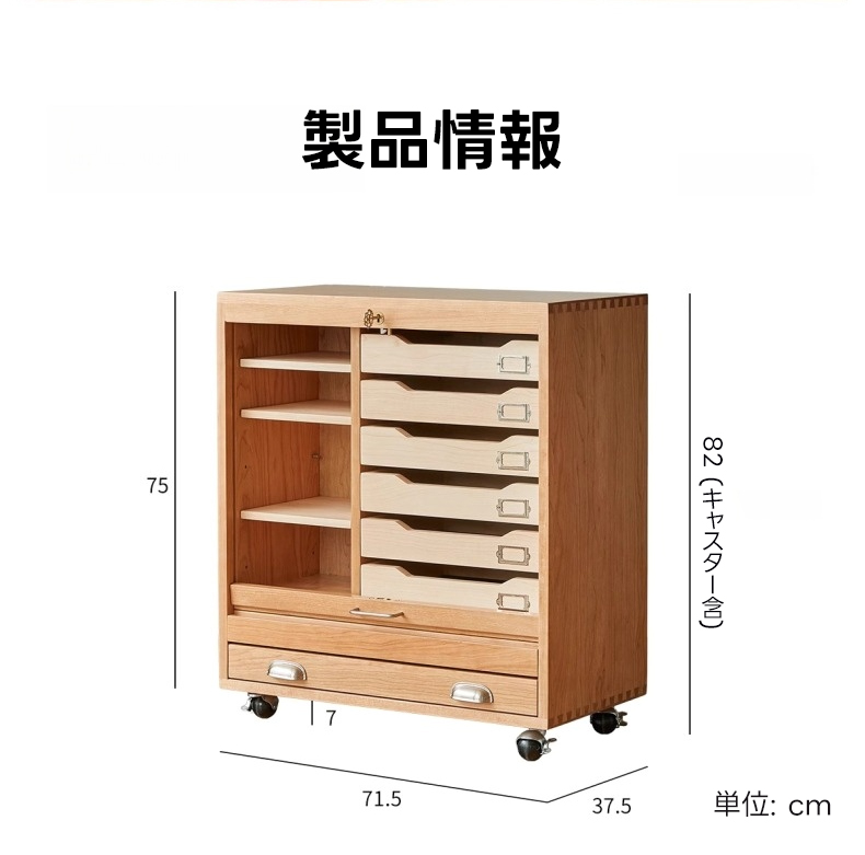 - 【多機能収納キャビネット】このチェリー材シャッター式キャビネットは、6段の引き出しとオープンスペースを備え、書類や小物を効率的に整理できます。シャッター式扉により、ほこりを防ぎプライバシーを守ります。
