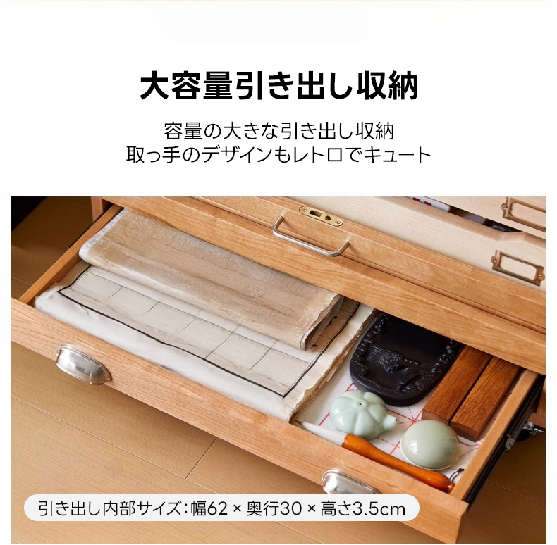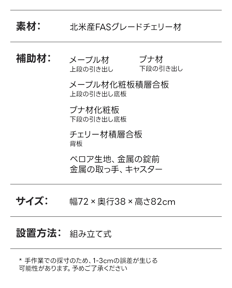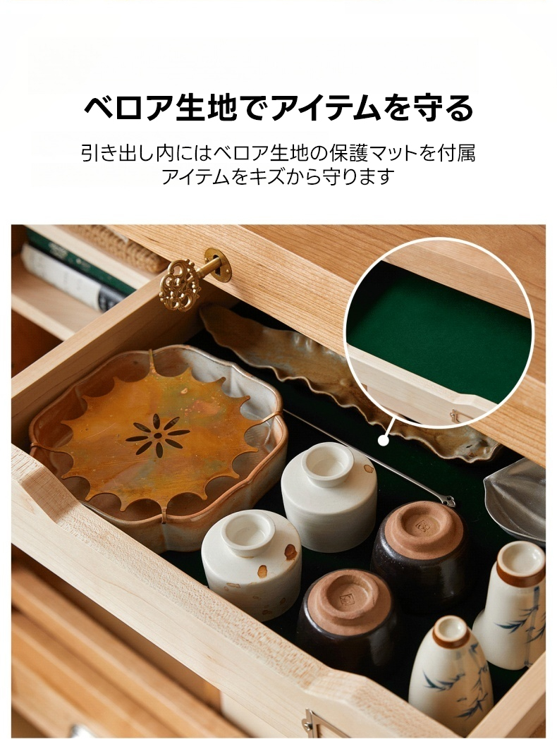 - 【高品質な素材とデザイン】北米産FASグレードのチェリー材を使用し、高級感を演出。メープル材やブナ材を補助材として採用し、ベルベットの保護マットが引き出し内に敷かれています。