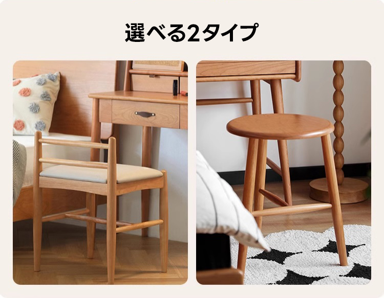- 【高級感あふれるチェリー材使用】北米産の最高品質FAS級チェリー材を使用したドレッサースツールです。美しい仕上がりと色ムラの少なさが特徴で、長く使うほどに味わいが増します。